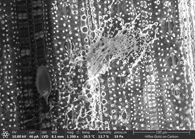 科学意义:图为假稻李氏禾病害的叶表表现,病原菌在李氏禾叶内大量繁殖后分泌出的胞外多糖结构黏附在叶表,在这个黏附物里面可以看到有大量的细菌在里面生存,它为细菌提供了一个很好的生活环境。