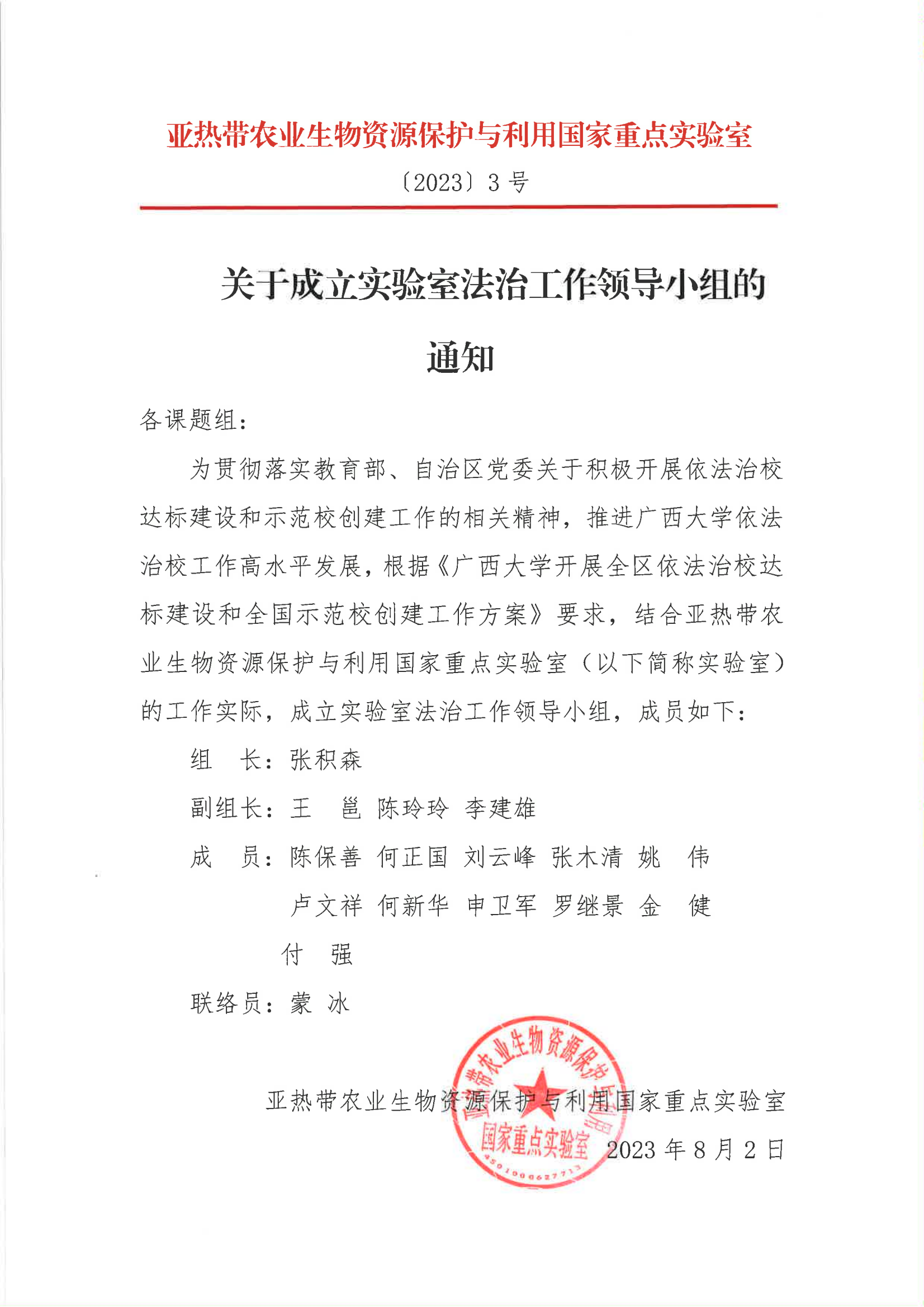 关于成立实验室法治工作领导小组的通知