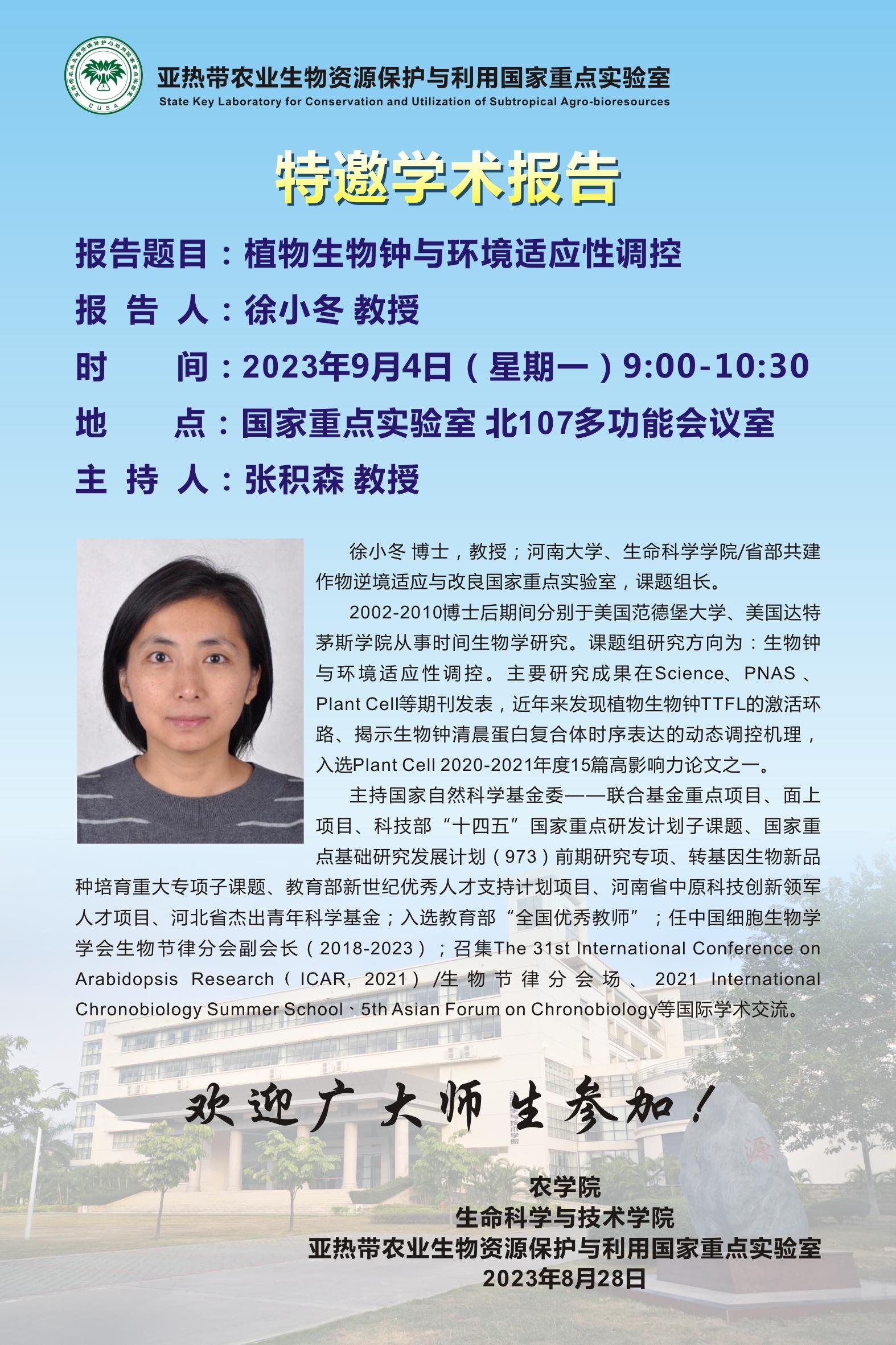 特邀学术报告:植物生物钟与环境适应性调控(徐小冬);高通量和精准基因编辑技术助力生物育种(钱扬文)