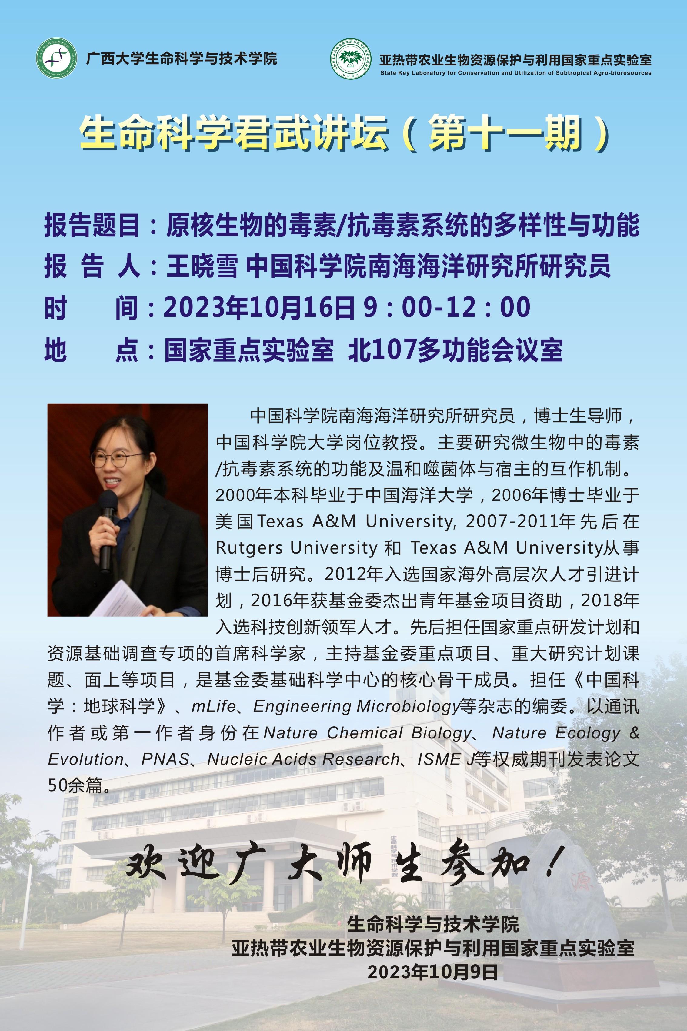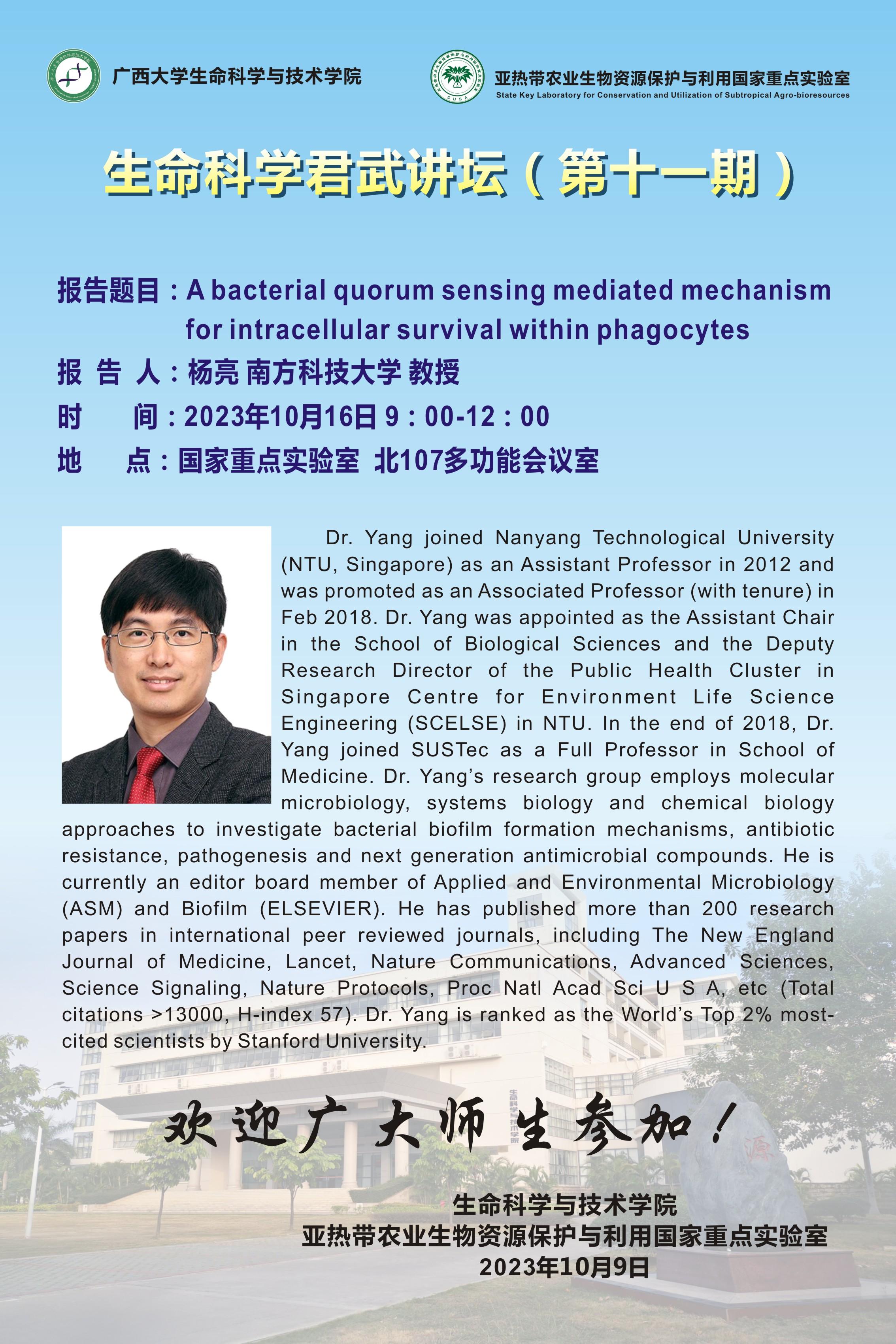 特邀学术报告:原核生物的毒素/抗毒素系统的多样性与功能(王晓雪);A bacterial quorum sensing mediated mechanism for intracellular survival within phagocytes(杨亮)