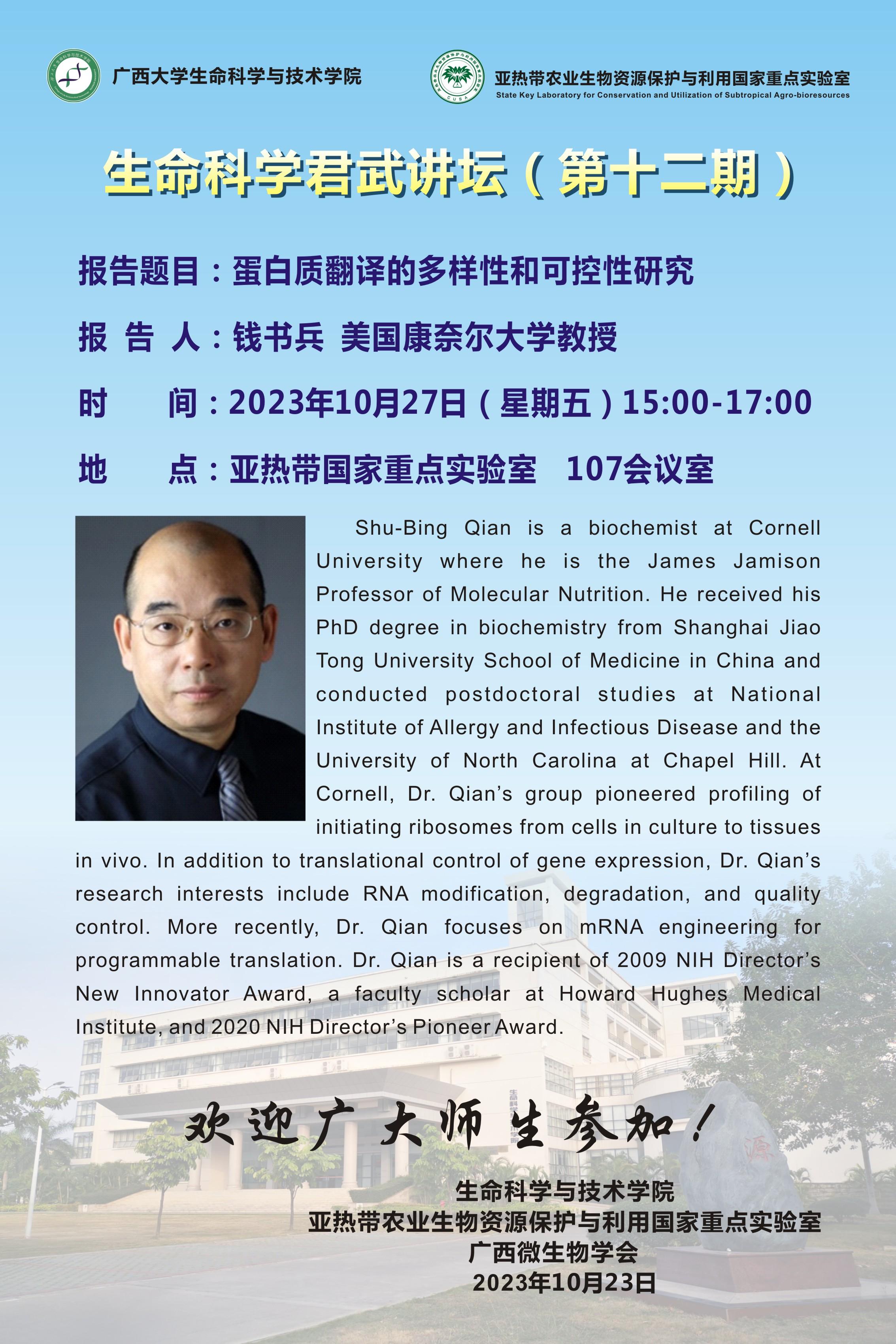 生命科学君武讲坛(第十二期): 蛋白质翻译的多样性和可控性研究