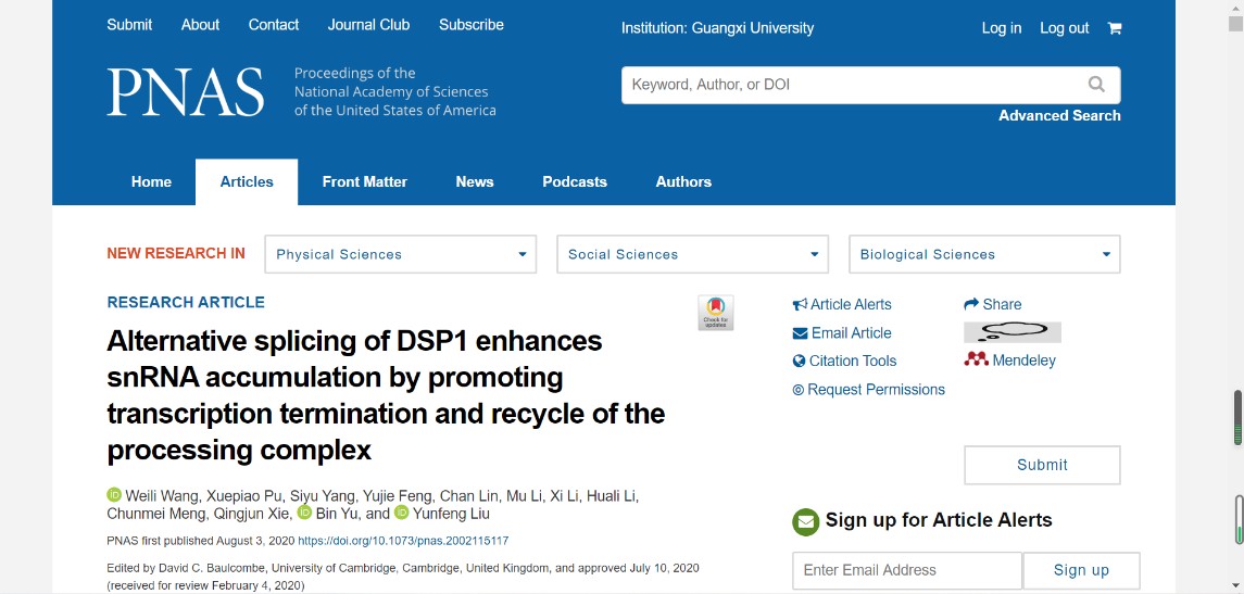 2020年8月,太阳集团2007亚热带国重实验室刘云峰课题组在国际著名学术期刊PNAS(PROCEEDINGS OF THE NATIONAL ACADEMY OF SCIENCES OF THE UNITED STATES OF AMERICA, IF5Y=9.516)上在线发表了题为“Alternative splicing of DSP1 enhances snRNA accumulation by promoting transcription termination and recycle of the processing complex”的研究论文(https://doi.org/10.1073/pnas.2002115117),揭示了植物中snRNA积累的空间调控机制。