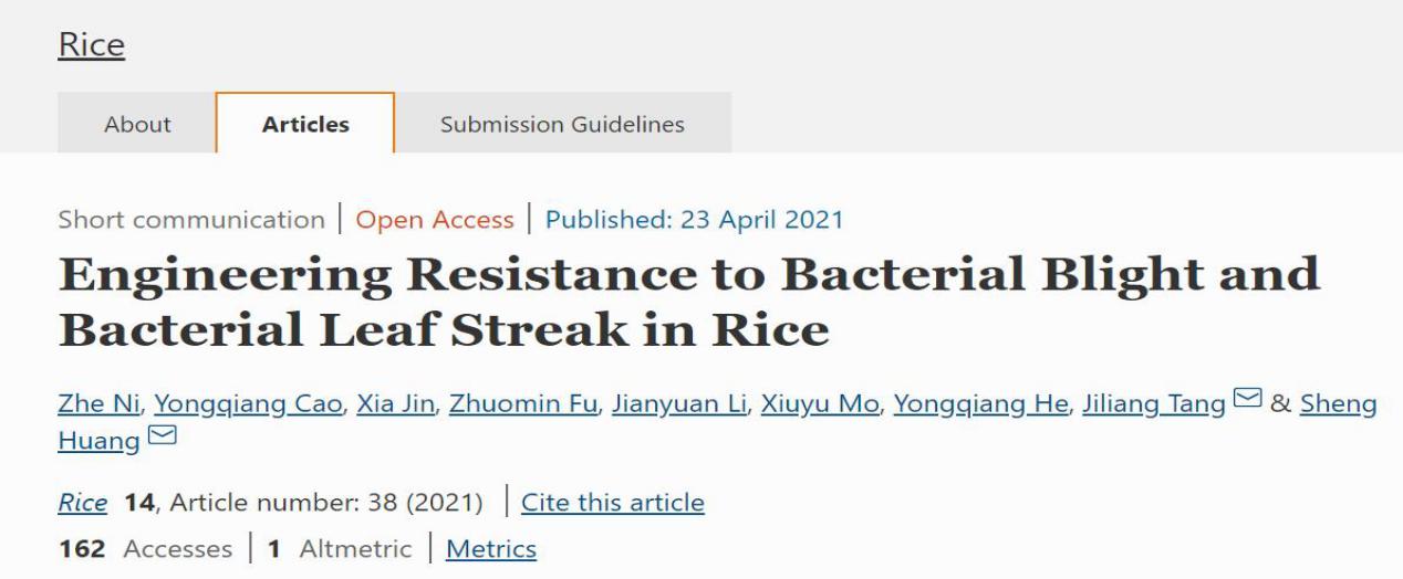 2021年4月23日,RICE(IF=3.912)在线发表了亚热带农业生物资源保护与利用国家重点实验室植物病原细菌团队题为“Engineering resistance to bacterial blight and bacterial leaf streak in rice”的研究简报。该团队利用基因编辑技术(CRISPR/Cas9)对同一水稻的OsSWEET11、OsSWEET14和 OsSULTR3;6 三个感病基因的EBEs进行依次编辑和筛选,获得了OsSWEET11、OsSWEET14和 OsSULTR3;6 仍能正常表达但不再被TALEs结合及诱导的水稻品系。实验结果表明这些水稻新种质既抗白叶枯病也抗条斑病,而且其它生物学性状正常。该工作为进一步培育优良的水稻抗病新品种奠定了基础。