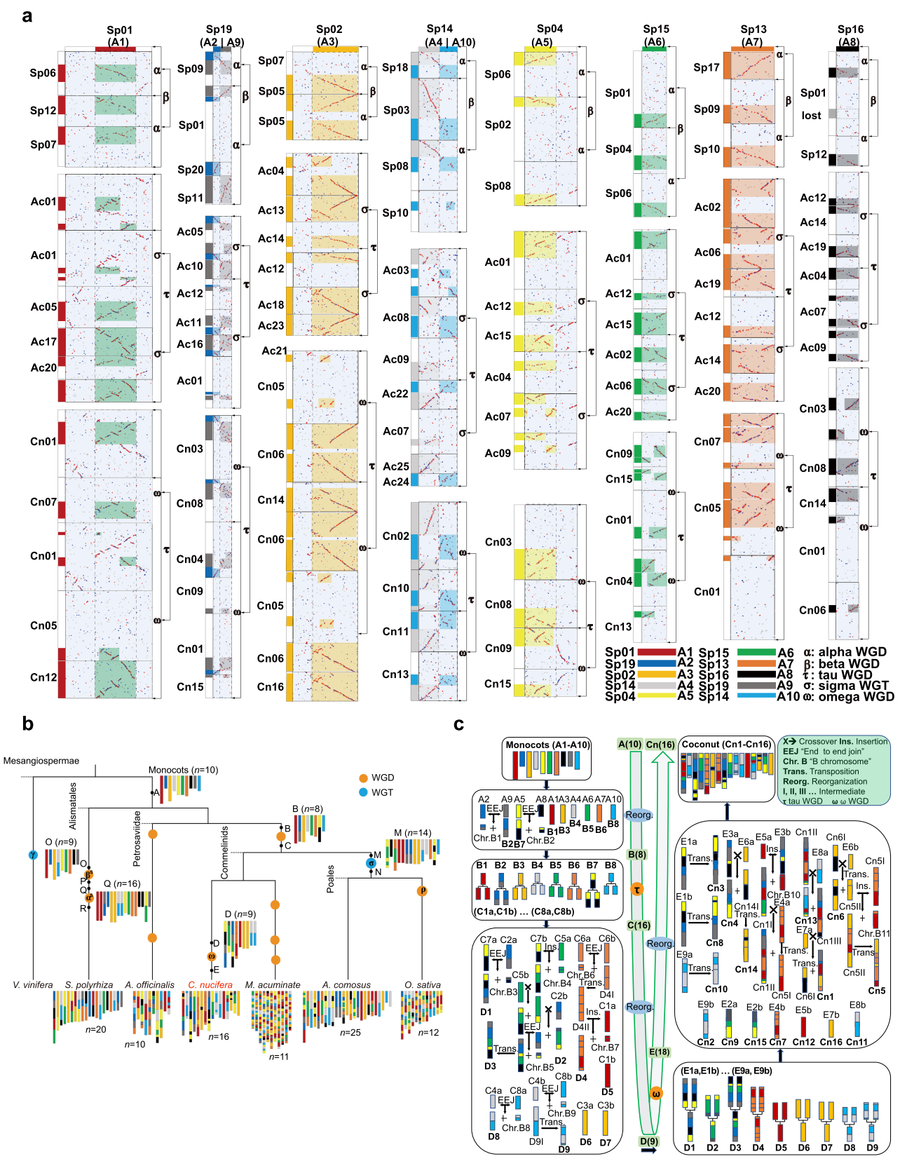 图3. 单子叶植物古染色体推断和现代椰子染色体进化轨迹重构