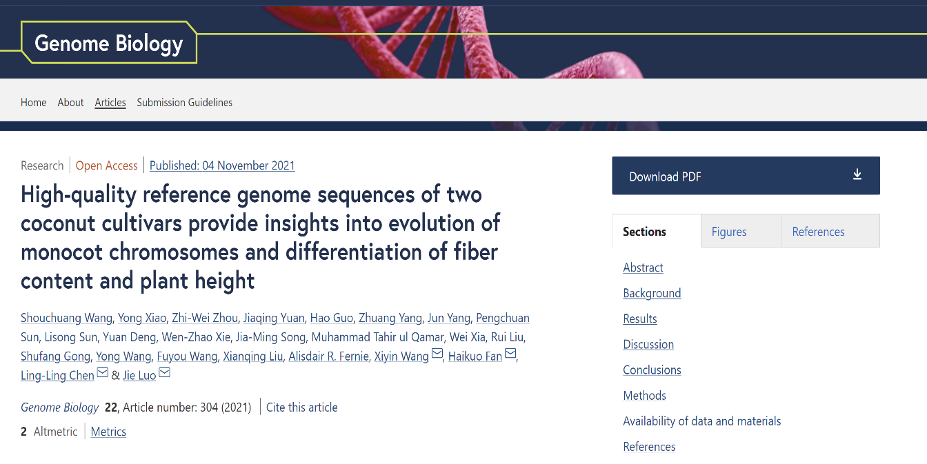 2021年11月4日,国际著名学术期刊 Genome Biology(影响因子13.6)在线发表了太阳集团2007生科院、亚热带农业生物资源保护与利用国家重点实验室陈玲玲教授团队与海南大学、华北理工大学以及中国热带农业科学院椰子研究所等相关单位团队联合完成的 “High-quality reference genome sequences of two coconut cultivars provide insights into evolution of monocot chromosomes and differentiation of fiber content and plant height”研究论文(图1),该研究绘制了存在较多性状差异的高、矮种椰子的高质量参考基因组。椰子所属的棕榈科是单子叶植物中最古老的类群之一,是研究单子叶植物染色体进化和古代植物分化的理想物种。合作团队推断出从单子叶植物古染色体到现代椰子染色体形成的进化过程,在此基础上进一步解析了高、矮种椰子在株高、纤维含量等关键性状差异的遗传基础,并发现GA20ox的自然变异可能是决定高、矮种椰子株高差异的关键因素,解密了发生在约400万年前的椰子“绿色革命”。