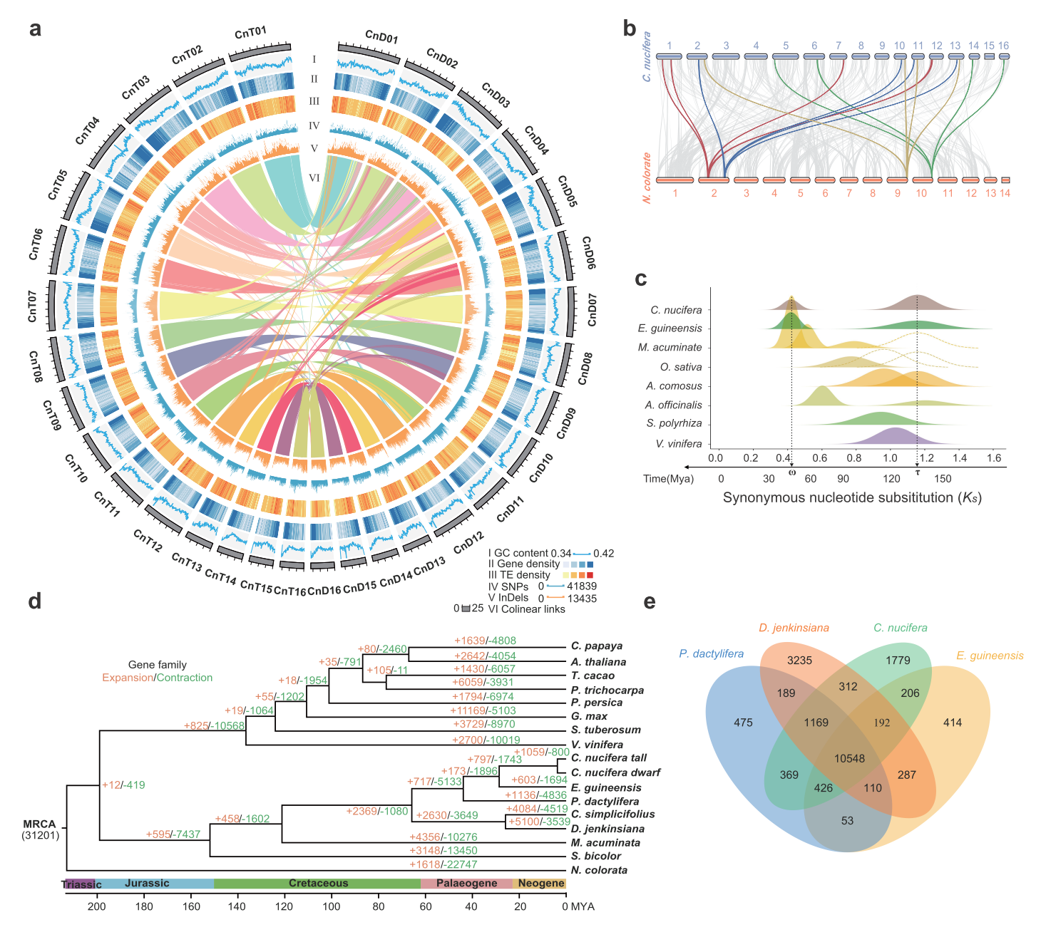 合作团队基于Nanopore、Hi-C和Illumina等测序数据组装并注释了高、矮种椰子染色体水平的参考基因组(两种椰子基因组大小分别为2.39 Gb和2.40 Gb)。通过椰子基因组与睡莲及油棕等的比较分析,揭示椰子发生过两次全基因组加倍事件,其中一次为棕榈科特有。椰子与同为棕榈科的油棕在约2700万年前发生分化,高、矮种椰子在约400万年前发生分化(图2)。