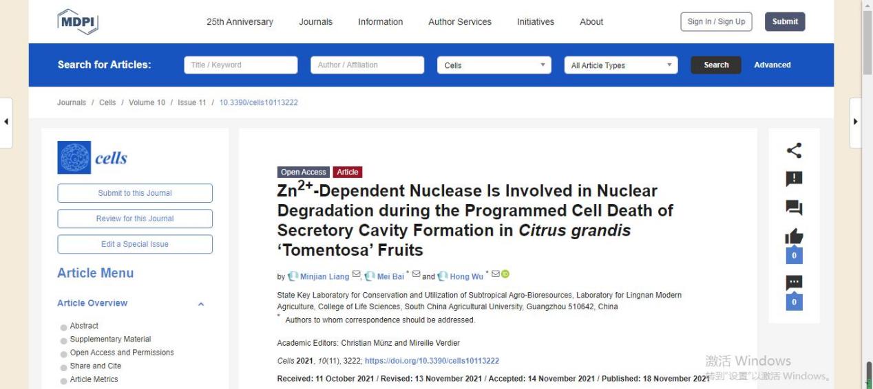 近日,亚热带农业生物资源保护与利用国家重点实验室、华南农业大学生命科学学院吴鸿教授课题组,在细胞生物学国际学术期刊cells (2020年影响因子6.6, https://doi.org/10.3390/cells10113222) 在线发表了题为 “Zn2+-dependent nuclease is involved in nuclear degradation during the programmed cell death of secretory cavity formation in Citrus grandis ‘Tomentosa’ Fruits” 的研究论文,首次报道了一个锌离子依赖核酸酶参与柑橘属植物果实分泌囊细胞程序性死亡(PCD)过程中细胞核降解。吴鸿教授和白玫副研究员为通讯作者,梁敏坚博士为第一作者。