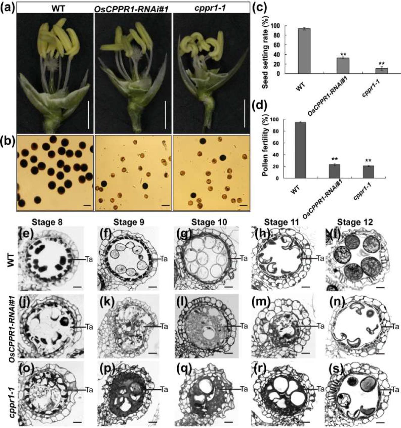 图1. 野生型(WT)、OsCPPR1-RNAi#1和cppr1-1水稻植株的表型和花药发育比较