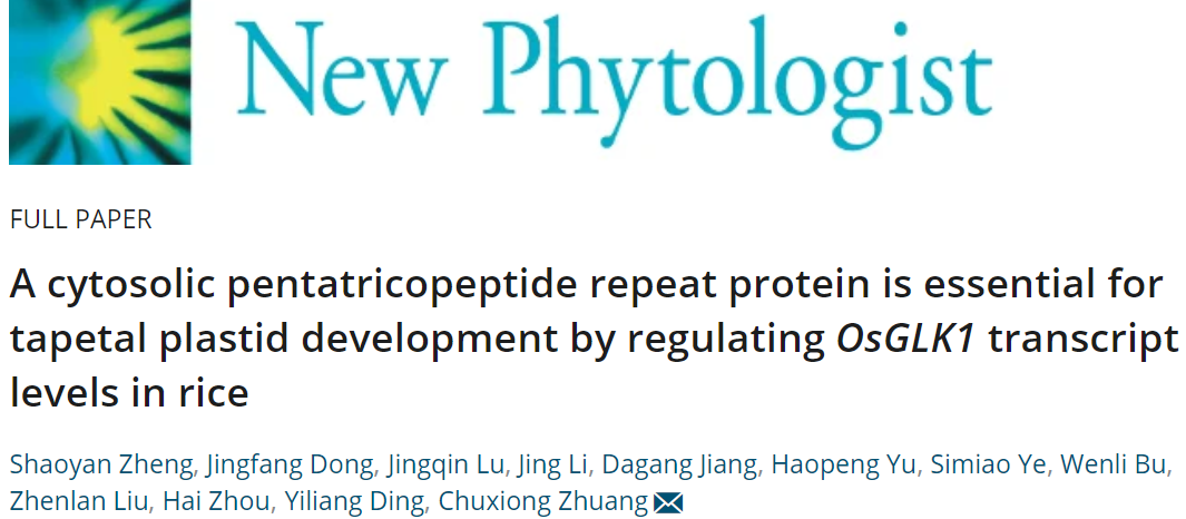 2022年3月20日,New Phytologist在线发表了华南农业大学亚热带农业生物资源保护与利用国家重点实验室庄楚雄研究团队题为“A cytosolic pentatricopeptide repeat protein is essential for tapetal plastid development by regulating OsGLK1 transcript levels in rice”的研究论文。该研究报道了定位于细胞质的OsCPPR1蛋白通过下调OsGLK1转录水平来调控水稻绒毡层质体发育,从而确立了一种新的水稻花粉发育调控机制,为作物改良提供了一种新途径。