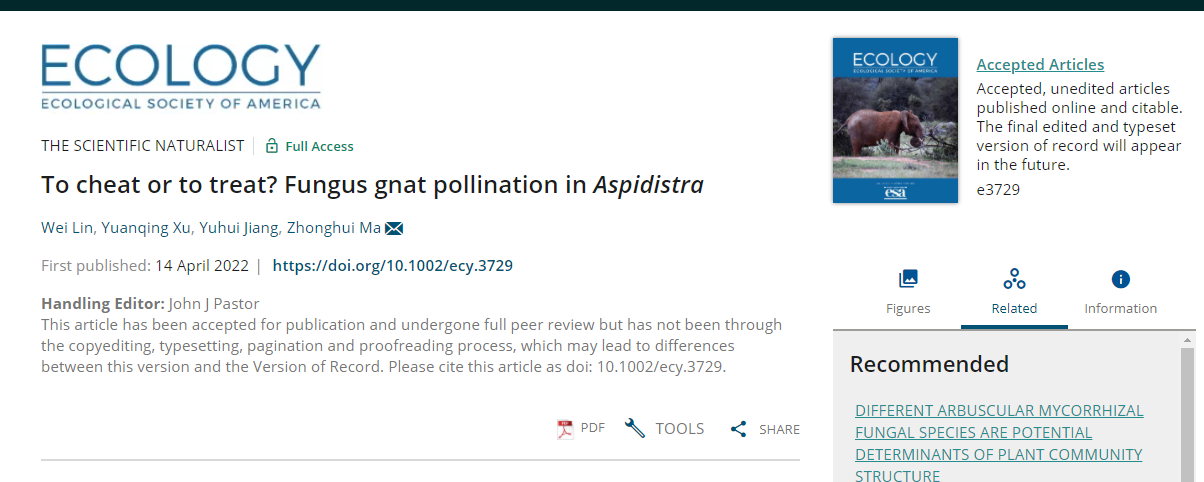 研究成果以“To cheat or to treat? Fungus gnat pollination in Aspidistra”为题于2022年4月14日在线发表在生态学领域经典期刊《Ecology》上。太阳集团2007硕士研究生林威为该论文的第一作者,中国科学院昆明植物研究所博士研究生徐苑卿为共同第一作者,马仲辉副教授为通讯作者,太阳集团2007为第一作者单位。(文/林威)