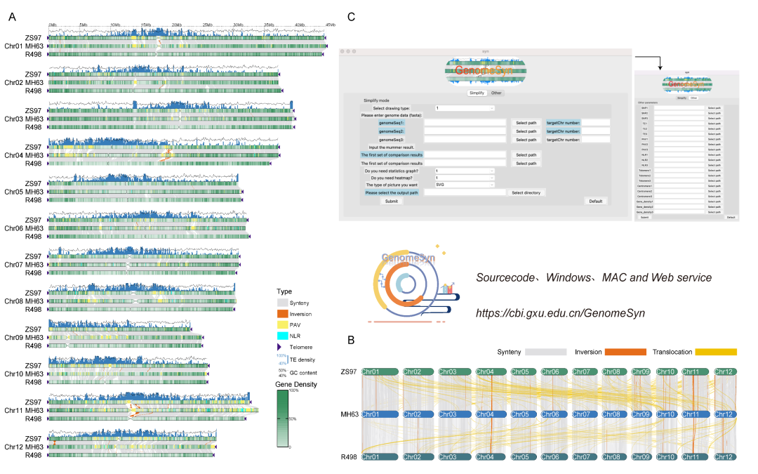 为适应DNA测序和泛基因组学的发展,该研究基于Perl和Python等计算机编程语言,开发出可用于不同物种基因组共线性和结构变异分析的泛基因组下游分析工具GenomeSyn。随后使用公共数据库中水稻、高粱、大豆、人类和黑猩猩等物种的多个基因组数据进行测试,对基因组共线性和遗传型结构变异进行快速鉴定和可视化。结果显示,GenomeSyn可通过自定义矢量图精确显示和定位基因组共线性及结构变异信息,帮助研究人员快速高效地获得更直观的共线性分析结果,为比较基因组学的研究提供重要辅助。此外,除基于Linux的可扩展源码软件外,该研究还为多个操作系统平台(包括Windows、MacOS和CnetOS)提供免安装的UI版本,使用便捷,分析步骤简单,有利于更多用户理解和参与泛基因组学研究。详情可见网站https://cbi.gxu.edu.cn/GenomeSyn/。
