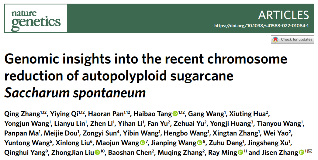2022年6月2日,福建农林大学海峡联合研究院基因组中心张积森团队在Nature Genetics上发表了题为"Genomic insights into the recent chromosome reduction of autopolyploid sugarcane Saccharum spontaneum"的研究论文,解析了细茎野生种(又称割手密种)天然同源四倍体Np-X基因组,并利用基因组学手段系统阐明了甘蔗细茎野生种的起源、染色体基数、基因组倍体、关键性状相关基因的演化,为甘蔗的基因组辅助育种奠定了重要的理论基础。值得一提的是,这是基因组中心团队继2018年解析甘蔗基因组(Zhang et al., 2018, Nature Genetics)后的又一重大进展。