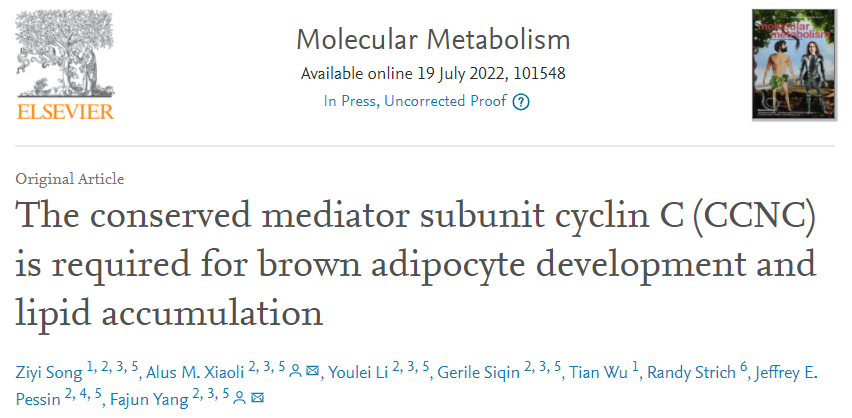 近日,太阳集团2007动物科学技术学院、亚热带农业生物资源保护与利用国家重点实验室宋子仪课题组与美国爱因斯坦医学院的研究团队合作在国际代谢领域专业期刊Molecular Metabolism (IF:8.568)在线发表了题为“The conserved Mediator subunit Cyclin C (CCNC) is required for brown adipocyte development and lipid accumulation”的研究论文(论文在线链接:https://doi.org/10.1016/j.molmet.2022.101548)。该研究成果系统介绍了中介因子复合物亚基CCNC在胚胎期棕色脂肪发育和成年期棕色脂肪脂质沉积中的作用及其机制,为人们进一步理解棕色脂肪形成的分子调控机制提供了新见解。