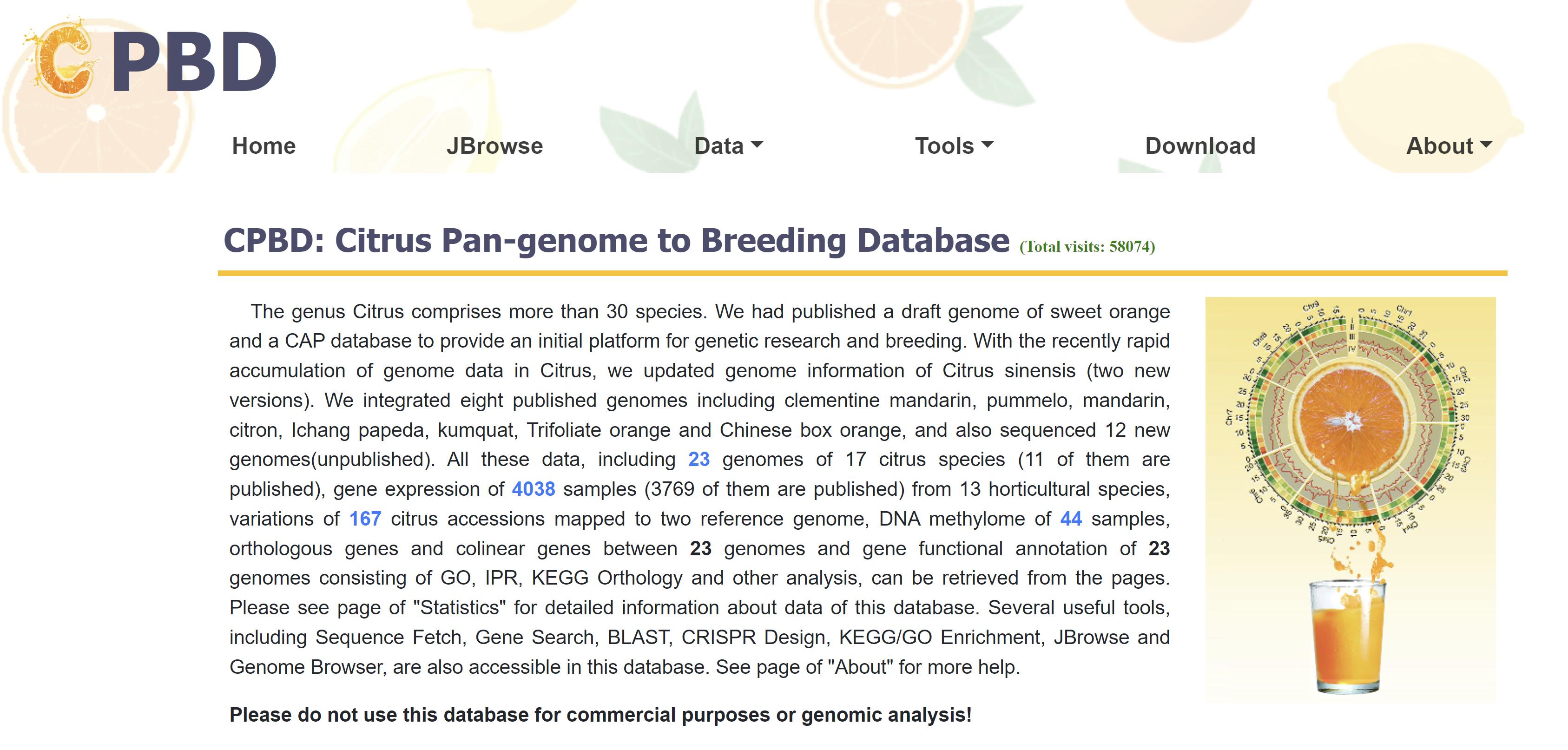 该研究构建的柑橘泛基因组辅助育种数据库CPBD (http://citrus.hzau.edu.cn/)涵盖17个柑橘物种的23个基因组、13种园艺作物的4038套转录组、167种柑橘资源材料的变异组数据以及44个柑橘样本不同组织和发育时期的DNA甲基化组数据,为目前已发表的最新和最为完整的柑橘基因组、表观组和园艺作物转录组数据集。同时提供23个基因组的同源基因查询、共线性区块分析和基因功能/通路注释等信息。