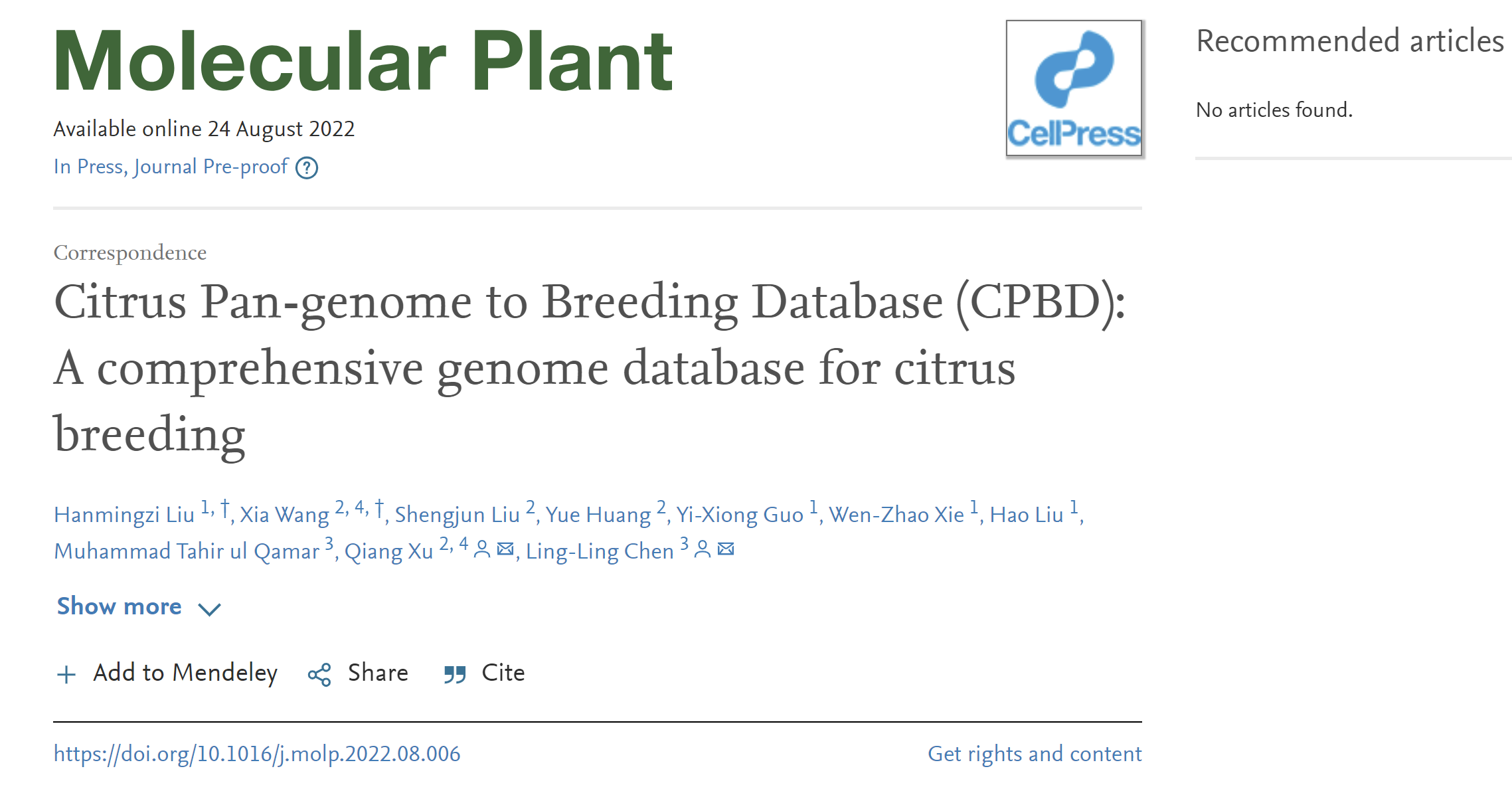 近期,太阳集团2007陈玲玲教授课题组和华中农业大学徐强教授课题组在Molecular Plant在线发表题为“Citrus Pan-genome to Breeding Database (CPBD): A comprehensive genome database for citrus breeding”的数据库文章,整合了柑橘属下多个物种的基因组、转录组、变异组和表观组的数据,开发相关在线工具,为柑橘的理论和育种研究提供了重要平台。
