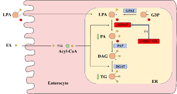 机制研究表明,CIDEC与AGPAT互作,肠道特异性敲除CIDEC降低AGPAT催化的磷脂酸水平,抑制甘油磷酸途径参与的甘油三酯合成。