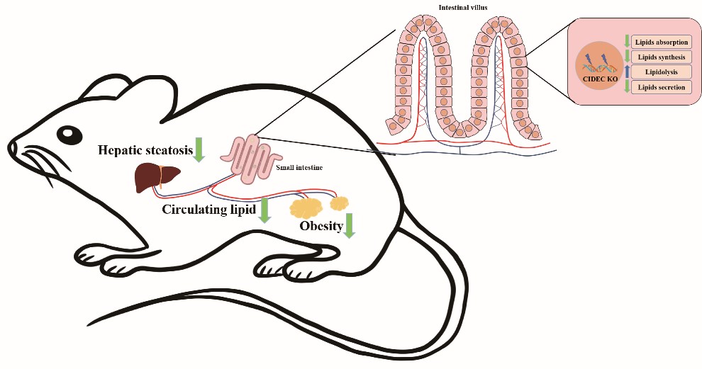 脂滴结合蛋白CIDEC的主要功能是抑制脂质分解,促进细胞内脂质积累和单室脂滴形成。肠道是外源性脂质的主要消化吸收场所,在机体脂代谢平衡中扮演关键角色。本研究通过肠道特异性敲除CIDEC探究不同饮食条件下肠道CIDEC对机体脂代谢的影响及其作用机制。结果显示,肠道特异性敲除CIDEC减少肠道对脂质的吸收,有效缓解饮食诱导的肥胖和肝脂肪变性。