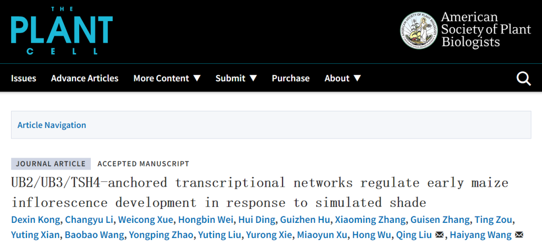 的研究论文,解析了玉米响应模拟密植条件下雄穗和果穗发育提前的转录调控变化,鉴定到一个以UB2/UB3/TSH4为核心的转录调控网络调控玉米花序发育响应密植遮荫信号。