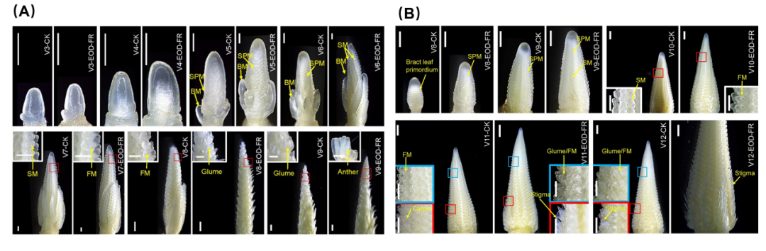 图1 EOD-FR处理下,玉米雄穗和雌穗发育特征。图注:SAM, shoot apical meristem:茎尖顶端分生组织 IM, inflorescence meristem:花序分生组织; SPM, spikelet pair meristem:小穗对分生组织; BM, branch meristem:分支分生组织, SM, spikelet meristem:小穗分生组织; FM. floral meristem:小花分生组织