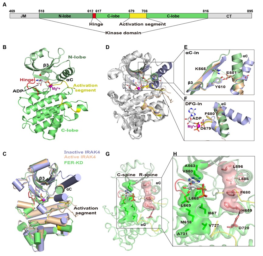 一般激酶在非磷酸化前,采用一类“αC-out”和/或“DFG-out”的失活构象,经磷酸化诱导形成“αC-in”和“DFG-in”的激活构象。研究人员获得了非磷酸化的FER-KD与ADP和Mg2+复合物(FER-KD-ADP-Mg2+)的晶体结构,发现未磷酸化的FER-KD采用“αC-in”、“DFG-in”的激活构象。为了确认FER-KD激活构象的形成确实不依赖于磷酸化,研究人员进一步解析了FER不能发生自磷酸化的突变体K565R以及自磷酸化能力部分降低的突变体S525A与核苷酸以及Mg2+复合物的晶体结构,发现这两类FER-KD的突变体均为激活构象形式。表明非磷酸化的FER-KD可以形成激酶激活状态下的典型构象。