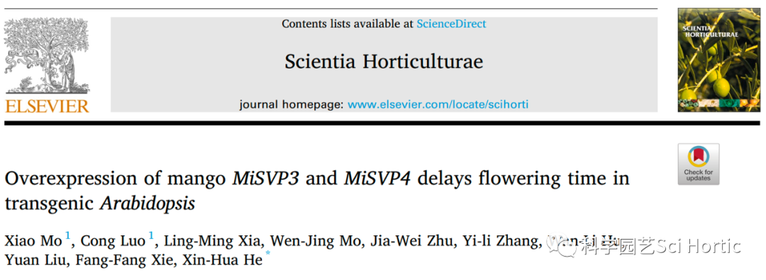近日,Scientia Horticulturae在线发表了太阳集团2007何新华教授和罗聪教授团队题为Overexpression of mango MiSVP3 and MiSVP4 delays flowering time in transgenic Arabidopsis的研究论文。