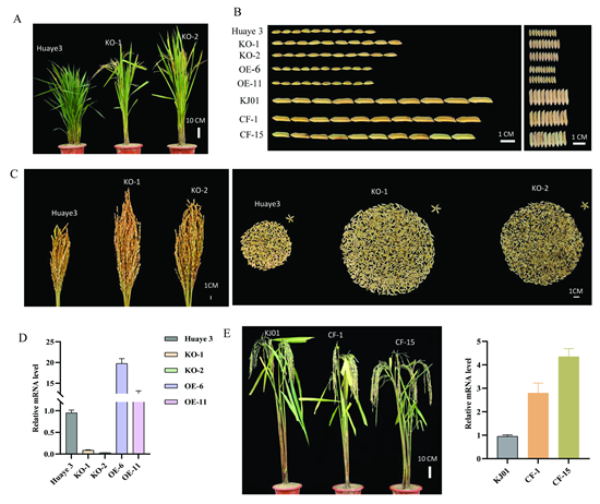 注:A. 敲除突变体的株型分析;B. 敲除突变体、过量表达突变体及互补转化体的粒长、粒宽分析;C. 敲除突变体的单株产量分析;D. 敲除突变体和过量表达突变体的RNA表达水平分析;E. 互补转化体的表型及RNA表达量分析。