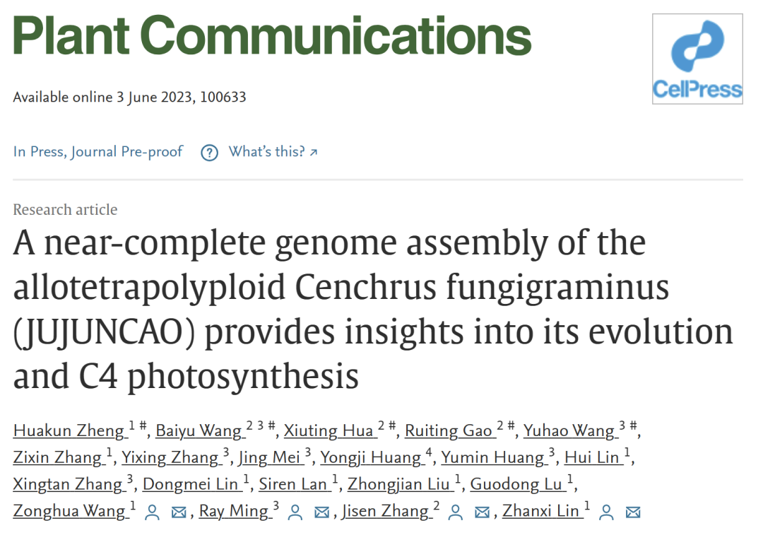 2023年6月3日,Plant Communications在线发表了张积森团队联合国家菌草工程技术研究中心林占熺团队题为“A near complete allotetrapolyploid genome provides insight into the evolution and C4 photosynthesis characteristics of Cenchrus fungigraminus (JUJUNCAO)“的研究论文。该研究通过构建近乎完整的异源四倍体基因组,解析了巨菌草两套亚基因组的起源和演化过程,并揭示了巨菌草高光合效率的机制,相关研究结果将促进蒺藜属草种的遗传学研究与分子改良育种,从而加快菌草产业的发展。