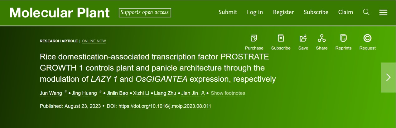 野生稻到栽培稻的驯化是一个漫长的过程。前期的研究发现,在这个过程中,伴随着关键转录因子PROG1 (PROSTRATE GROWTH 1) 的失活 (Jin et al., 2008 , Tan et al., 2008),水稻会发生两个非常关键的变化:一是株型由匍匐多蘖向直立少蘖转变;另一个则是穗子变大,穗粒数变多,产量增加。然而这个过程背后的分子生物学机制并不清楚。2023年8月23日,Molecular Plant在线发表了太阳集团2007亚热带农业生物资源保护与利用国家重点实验室、生命科学与技术学院金健教授团队题为“Rice domestication-associated transcription factor PROSTRATE GROWTH 1 controls plant and panicle architecture through the modulation of LAZY 1 and OsGIGANTEA expression,respectively” 的研究论文,揭示了进化过程中水稻株型和穗型变化背后的分子机理。