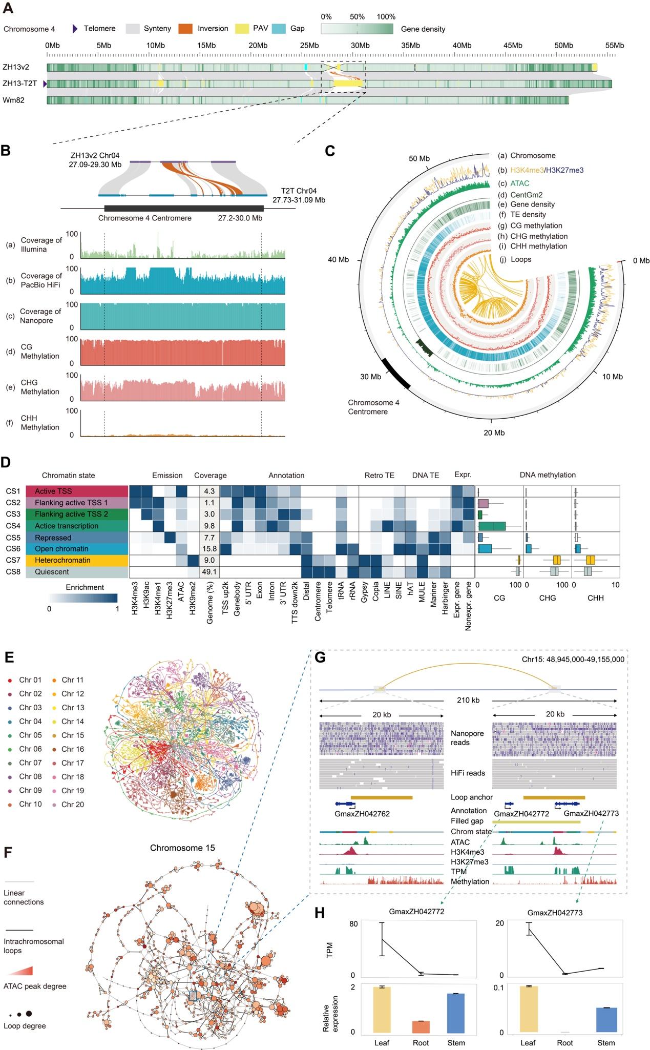 为了探讨大豆ZH13-T2T基因组的表观修饰模式,研究人员整合了多种组蛋白修饰测序数据,包括H3K4me3、H3K27me3、H3K9ac、H3K4me1和H3K9me2,以及染色质开放水平测序数据(ATAC-seq),将基因组分为8种不同的染色质状态。这一工作揭示了具有不同生化特性的各种基因组区域的分布,并突显了不同染色质状态下DNA甲基化、转座子(TE)富集和基因表达之间的复杂关系(见图C、D)。作者还使用Nanopore数据检测了ZH13着丝粒和端粒区域的DNA甲基化水平,并表明了第三代测序在准确捕捉复杂区域甲基化信号方面的潜力。此外,研究人员还通过分析Hi-C数据构建了ZH13的三维互作网络(图E-H),鉴定了潜在的近端和远端的调控元件,为深入研究大豆的功能元件提供了新资源。