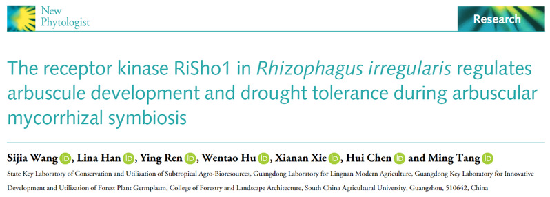 近日,太阳集团2007华南农业大学唐明教授团队在New Phytologist上发表了题为“The receptor kinase RiSho1 in Rhizophagus irregularis regulates arbuscule development and drought tolerance during arbuscular mycorrhizal symbiosis”的研究论文。该论文揭示了丛枝菌根真菌异形根孢囊霉(Rhizophagus irregularis)受体激酶RiSho1提高宿主植物耐旱性的分子机制,为丛枝菌根真菌增强植物抗旱能力提供理论依据。