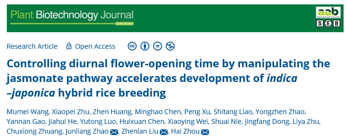 Wang M, Zhu X, Huang Z, Chen M, Xu P, Liao S, Zhao Y, Gao Y, He J, Luo Y, Chen H, Wei X, Nie S, Dong J, Zhu L, Zhuang C, Zhao J, Liu Z, Zhou H. Controlling diurnal flower-opening time by manipulating the jasmonate pathway accelerates development of indica-japonica hybrid rice breeding. Plant Biotechnol J, 2024, doi: 10.1111/pbi.14343.
