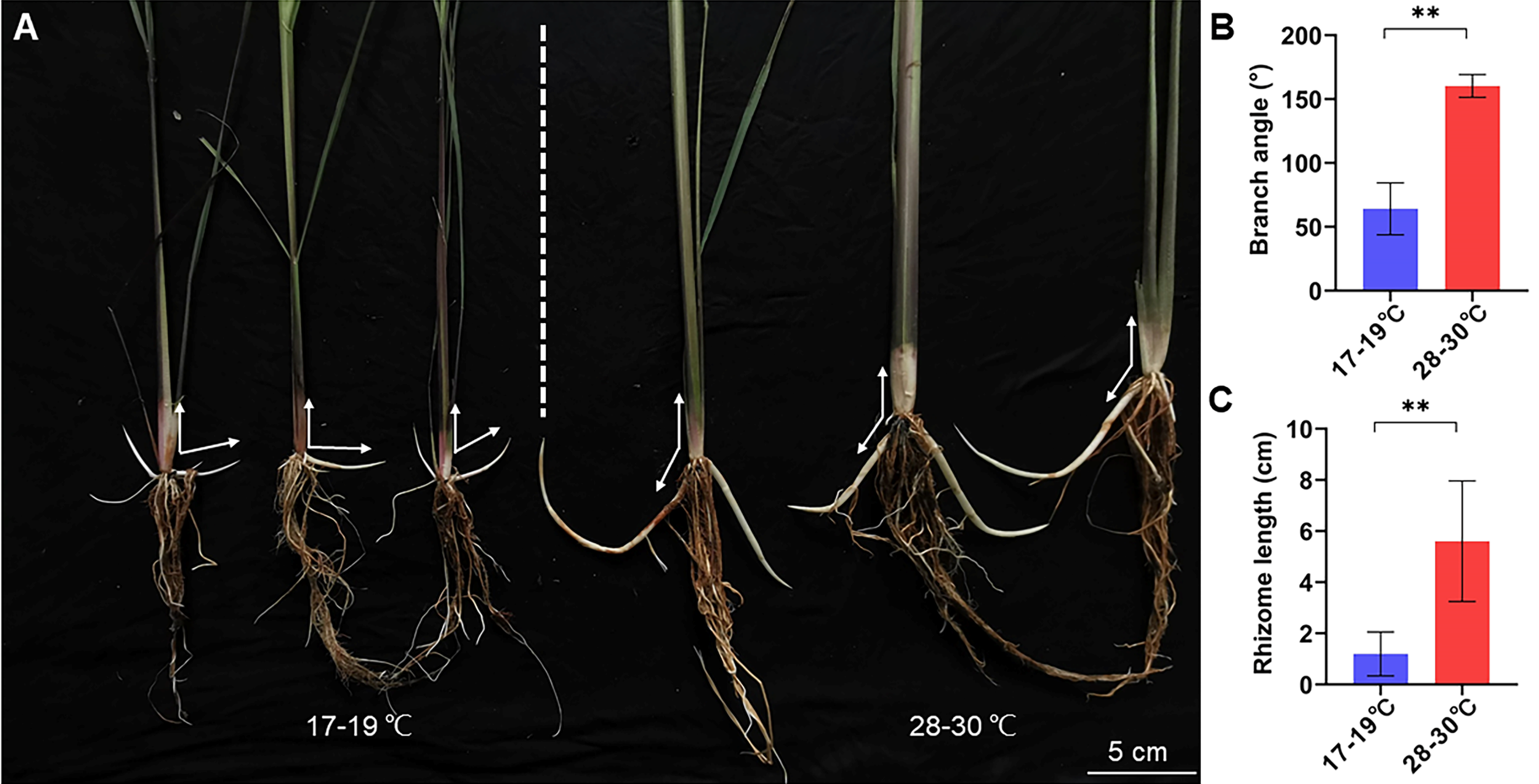 地下根状茎是禾本科植物实现多年生的重要器官,可在土壤中熬过恶劣的环境(比如低温、干旱等)。根状茎型野生稻中,仅长雄蕊野生稻(简称长野)具有跟栽培稻一样的AA基因组(Tao and Sripichitt 2000),长野还具有抗病虫害等优良的农艺性状(Sacks et al. 2003),是改良栽培稻品种和选育多年生水稻的优异种质资源。课题组前期研究发现,添加蔗糖能够增加长野根状茎的数量及长度(Fan et al. 2022)。但到目前为止,其他环境因素对长野根状茎发育的影响还未见报道。