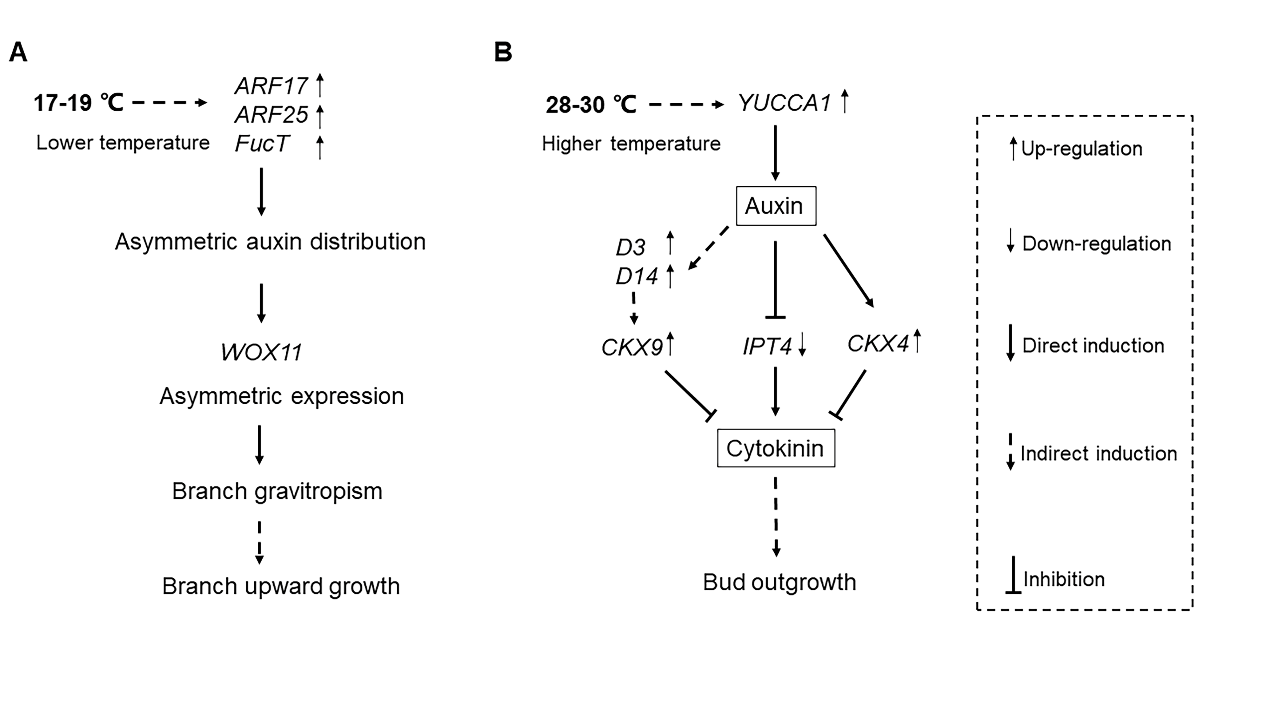 为了探索低温促进长野腋芽萌发及根状茎上翘的基因调控通路,通过转录组测序比较分析了高温和低温环境下长野基部短缩节(带有腋芽)的差异表达基因,并用qPCR进行了验证。结果表明,植物激素在温度调节长野根状茎发育的过程中发挥了重要作用。生长素分布调节基因ARF17、ARF25和FucT (Wang et al. 2022)在低温下上调表达,加剧了生长素不对称分布的程度,并诱导WOX11在根状茎的上下侧之间的不对称表达增强,进一步导致根状茎在低温下快速上翘(图4A)。在高温环境下,生长素生物合成基因YUCCA1和细胞分裂素氧化酶/脱氢酶基因CKX4和CKX9上调表达、细胞分裂素合成基因IPT4下调表达,最终导致细胞分裂素减少,不利于腋芽萌发。此外,在高温下,负调控腋芽萌发的独角金内酯信号转导途径中的D3和D14基因也被上调表达,抑制腋芽的萌发。上述结果表明,细胞分裂素、生长素和独角金内酯共同参与了温度调控长野腋芽的萌发过程(图4B)。