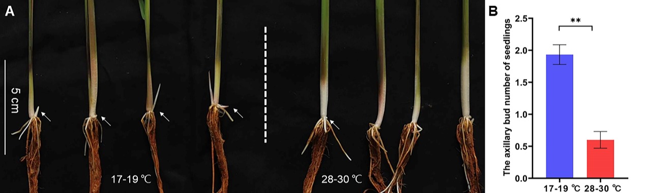 该研究通过土培、水培和组培等多种方式来比较高温和低温对长野腋芽发育的影响,发现较低的环境温度(17-19 ℃)更能促进长野腋芽的萌发(图2A);在相同的处理时间内,低温下长野的侧枝数量显著多于高温环境(28-30 ℃)的侧枝数量(图2B)。