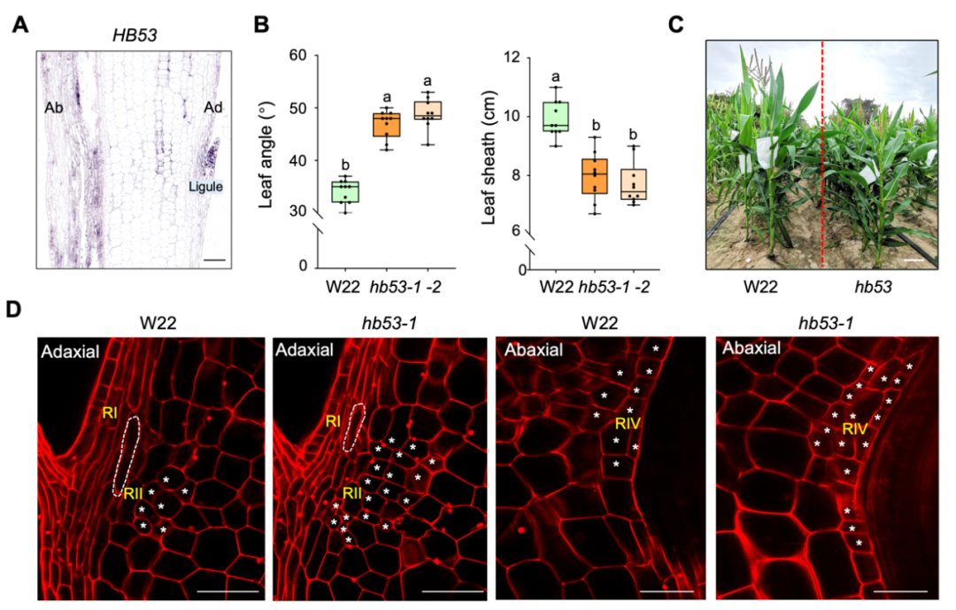 图 3. 转录因子HB53是玉米株型建成和避荫反应的重要调控因子