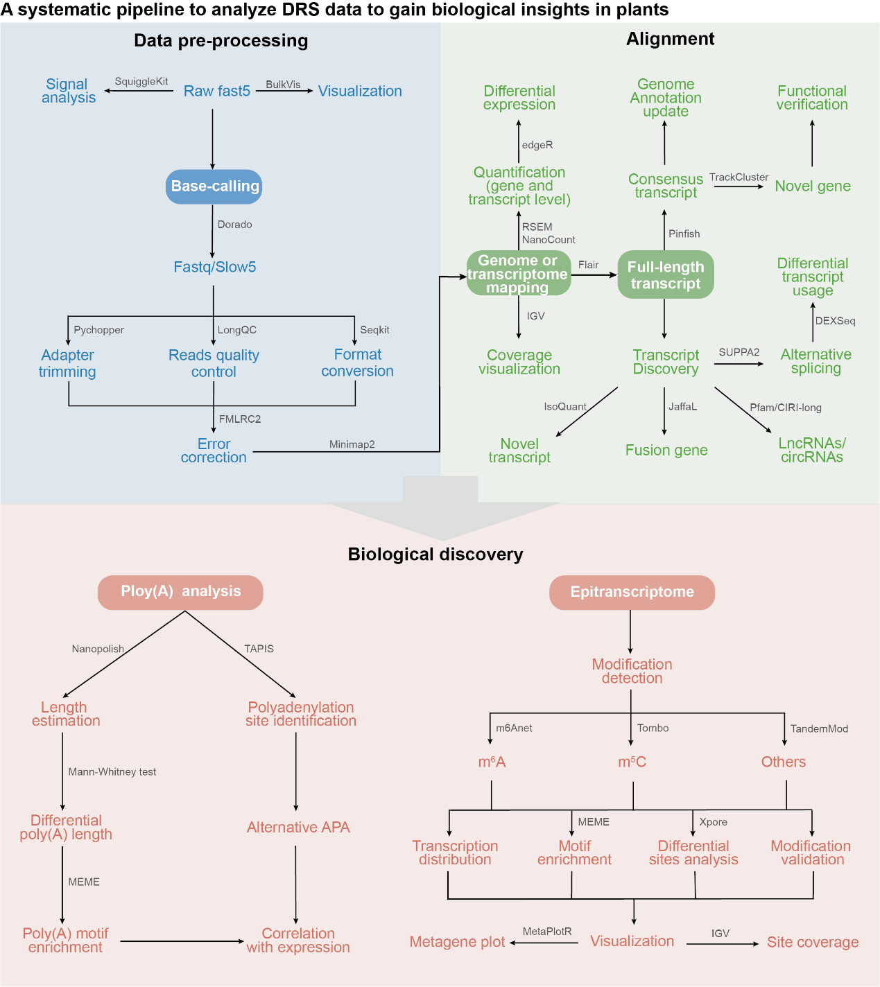 此外,综述基于现有文献提出了一个系统的DRS数据分析流程,包括数据预处理、比对和生物学发现三个部分。数据预处理涉及对原始电信号的可视化与分析,以及从中提取碱基信息的base-calling。当前DRS reads的碱基错误率仍高于传统的RNA-seq,因此可以通过使用匹配组织的RNA-seq数据矫正DRS reads。校正后的DRS reads可与参考基因组或转录组比对,以获取全长转录本。最后通过定量分析、poly(A)长度估计和RNA碱基修饰检测等手段将DRS数据转换为有意义的生物学发现。此外,基于第三方性能评估、在植物研究中的使用频率以及实际应用的便利性,文章对一些核心分析步骤推荐了一系列工具,如Dorado用于Base-calling、FMLRC2用于reads校正、NanoCount用于转录本定量、TandemMod用于修饰碱基检测等(图2)。