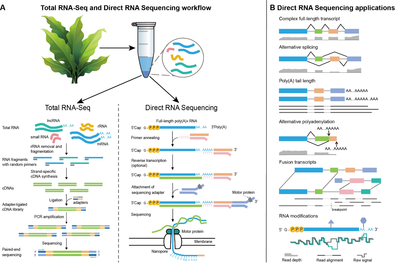 图1. 直接RNA测序(DRS)与全转录组测序文库构建流程的比较(A),以及DRS在植物研究中的主要应用(B)