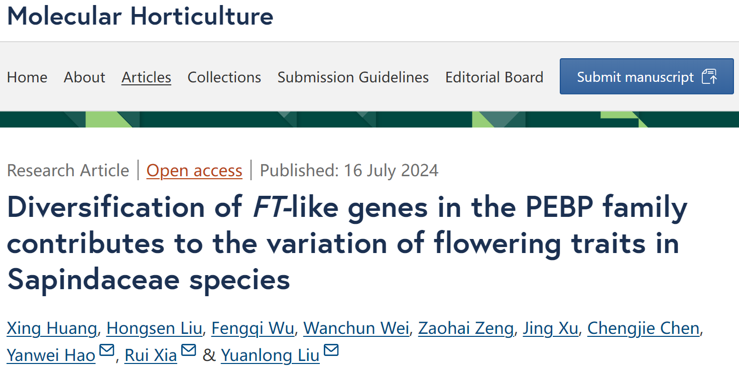 2024年7月16日,亚热带农业资源保护与利用国家重点实验室、华南农业大学夏瑞团队在Molecular Horticulture (IF:10.6)上在线发表题为“Diversification of FT-like genes in the PEBP family contributes to the variation of flowering traits in Sapindaceae species”的研究论文。该研究利用无患子科植物的基因组(Li et al. 2024)和大量转录组数据分析结合实验验证,揭示了无患子科植物FT基因编码区和启动子区的变异可能是导致无患子科植物开花性状变异的潜在机制。