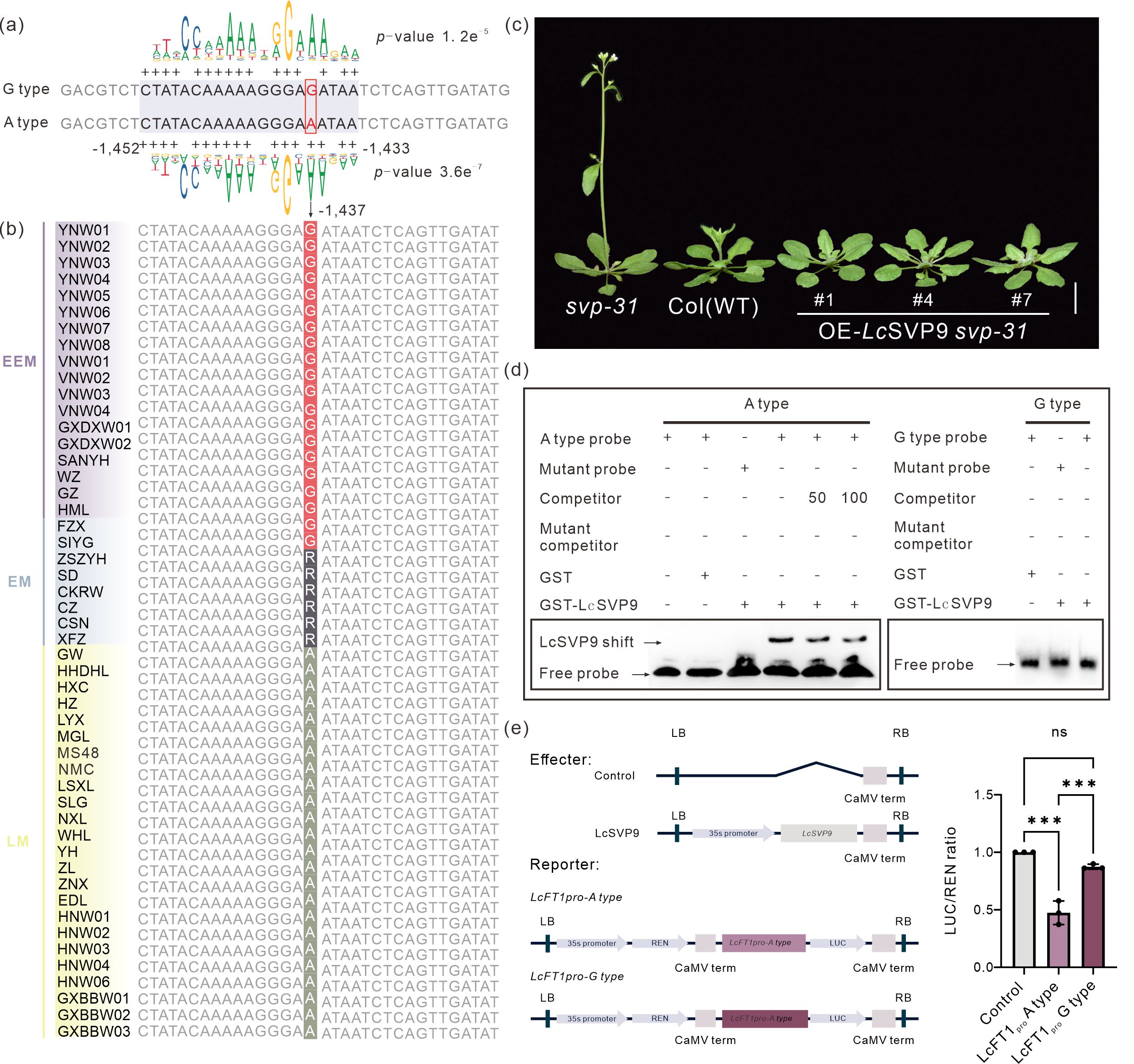 异源转基因表明,LcSVP9基因的过表达导致转基因拟南芥的开花时间推迟,表明LcSVP9是调控植物开花时间的负调控因子。电泳迁移试验(EMSA)和双荧光素酶报告基因实验结果表明,LcSVP9重组蛋白可与LcFT1启动子的A type基序结合,并对LcFT1具有转录抑制的作用;但不与LcFT1启动子的G type基序相结合,失去了对LcFT1的转录抑制的作用(图一)。即荔枝FT1启动子核苷酸位置 -1,437的SNP多态性决定了SVP蛋白(LcSVP9)与其结合亲和性,而LcSVP9作为开花负调控因子导致了LcFT1基因差异表达,可能与调节荔枝的开花时间有关。这一发现为荔枝育种提供了潜在的分子标记。