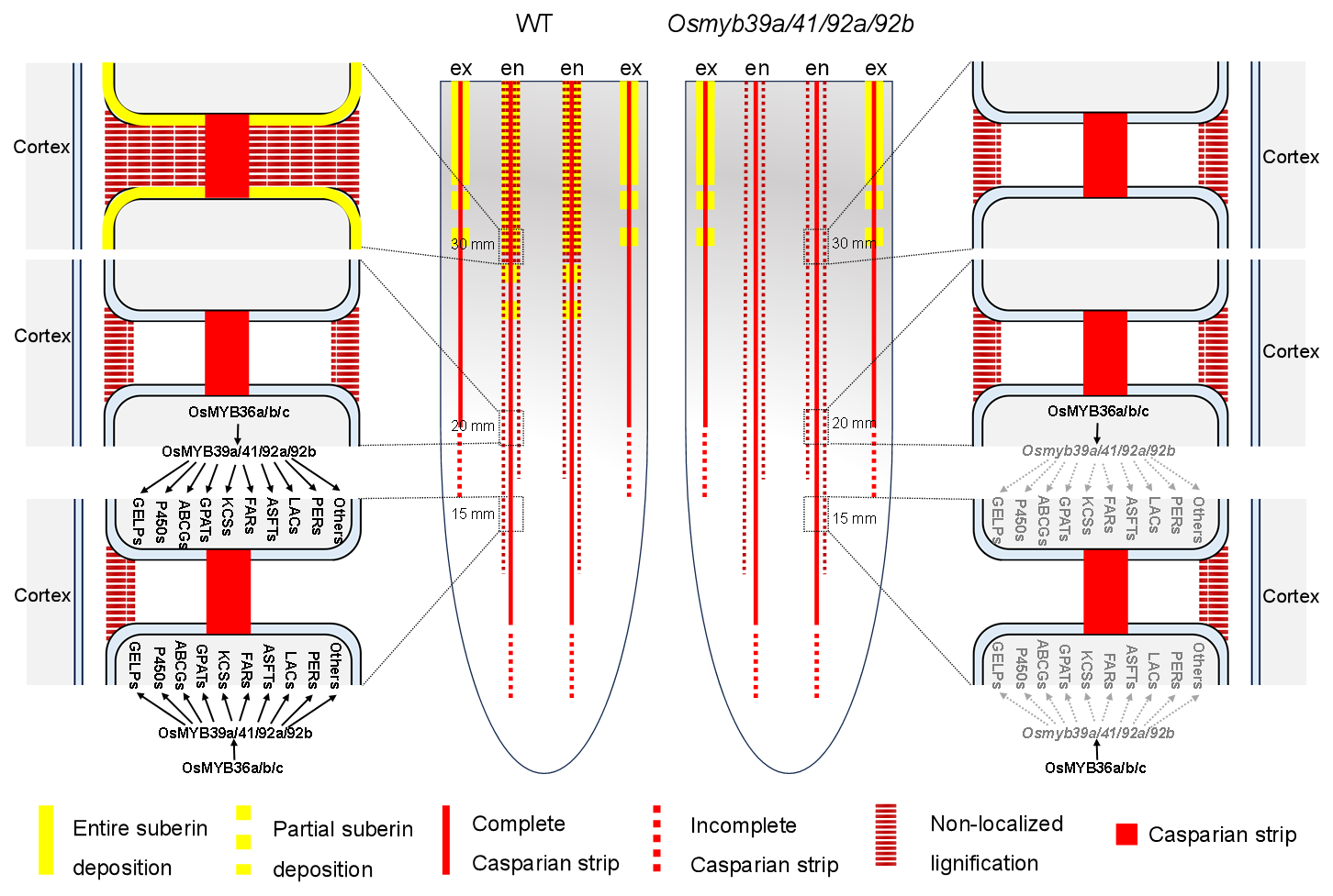 图4 OsMYB36a/b/c-OsMYB39a/41/92a/92b模块调控水稻内皮层木质化和木栓化的模式图