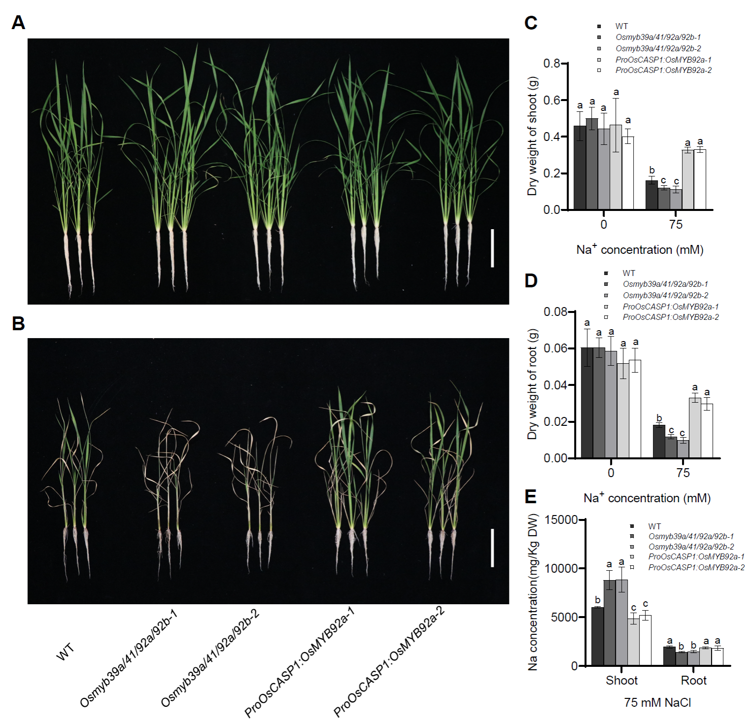 图3 野生型、Osmyb39a/41/92a/92b突变体以及OsMYB92a过表达株系耐盐性分析