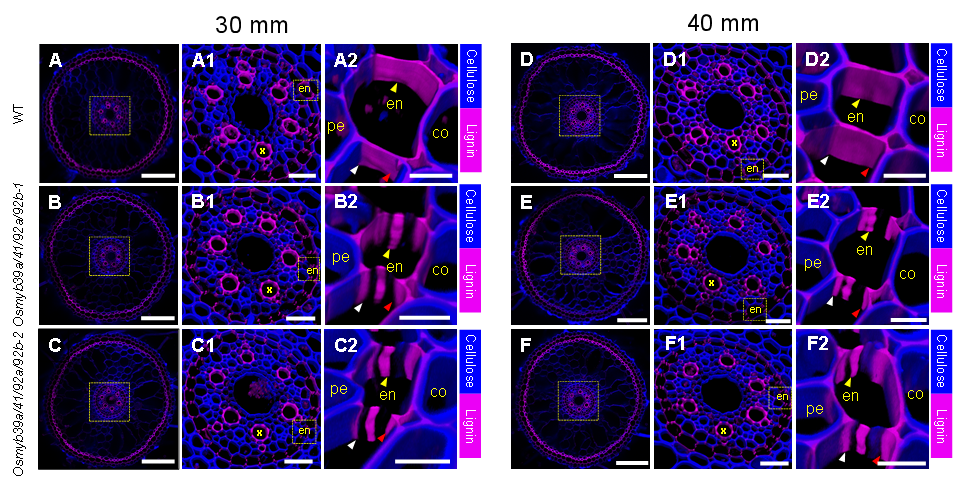 图1 野生型和Osmyb39a/41/92a/92b突变体根内皮层木质素累积的观察