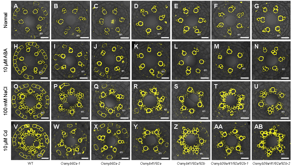 图2 在正常和胁迫条件下对野生型和Osmybs突变体根内皮层木栓质累积的观察