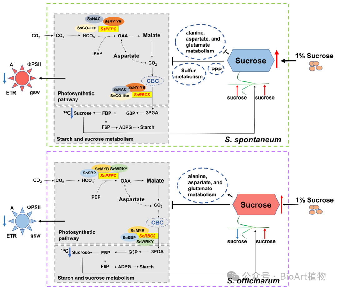 研究显示外源蔗糖处理后,割手密种和高贵种叶片基部的蔗糖含量均增加,叶片的光合作用均受到抑制,且割手密种和高贵种中大量下调的差异表达基因(DEGs)在光合作用相关通路中富集。然而,基因表达模式在两个甘蔗原始种中存在显著差异,只有少数差异表达基因(DEGs)在割手密种和高贵种之间共享,表明了它们对外源蔗糖的不同反应。PEPC、Rubisco小亚基编码基因(RBCS)以及一些与糖响应或糖代谢相关的基因在割手密种和高贵种中表现出不同的共表达模式。此外,参与磷酸戊糖途径以及丙氨酸、天冬氨酸和谷氨酸代谢的DEGs在割手密种中独特富集,这可能导致了两个甘蔗核心原始种叶片中蔗糖含量的差异变化。