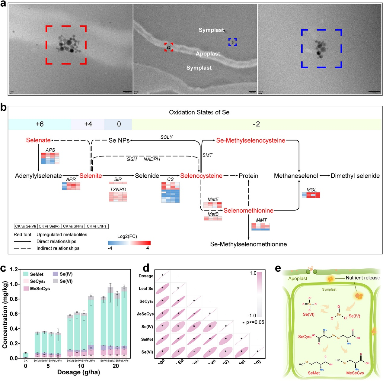 透射电镜(TEM)获得了纳米颗粒吸收的直接证据。图3a显示纳米颗粒不仅存在于叶片细胞间隙,还穿透细胞壁进入共质体;这表明叶片表面存在渐进性渗透,纳米颗粒移动至叶肉组织及细胞内空间。值得注意的是,颗粒尺寸在不同程度上减小,表明进入叶片后发生渐进性溶解,从而释放出离子态营养物。为进一步了解硒纳米颗粒在小麦组织中的转化过程,本研究检测了小麦叶片中与硒代谢相关基因的表达情况。