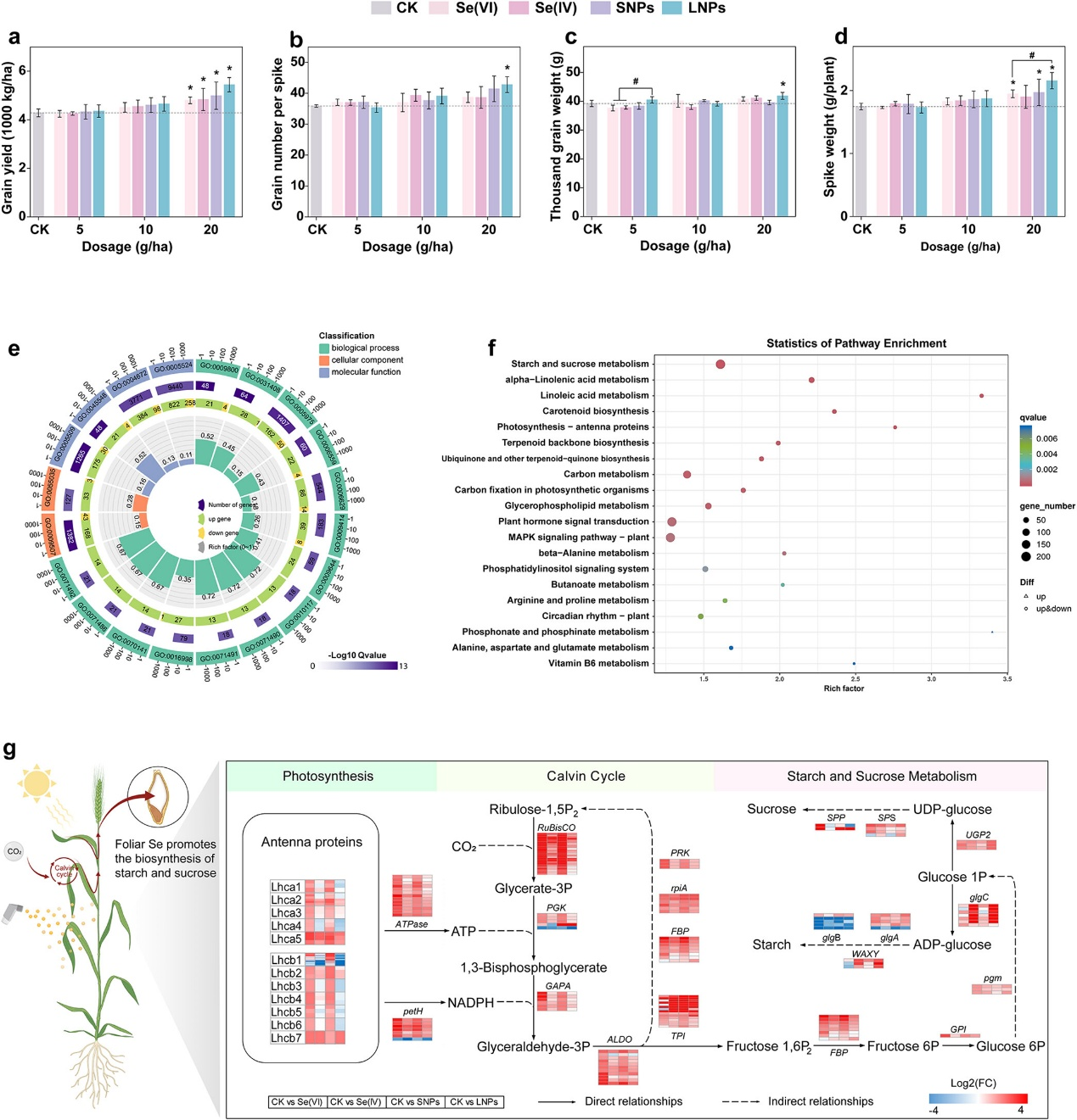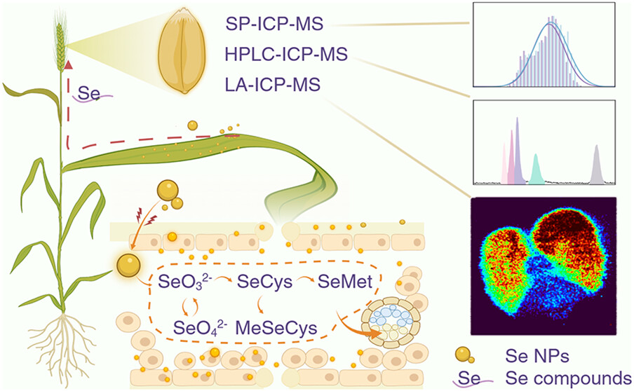 研究思路:利用硒纳米颗粒(NPs)对小麦进行硒生物强化,为解决全球人口硒缺乏问题提供了一种颇具前景的干预手段。然而,关于纳米颗粒暴露可能带来的健康风险仍存在担忧,更重要的是,植物对硒纳米颗粒的吸收、转运和转化机制尚未完全明晰。本研究开展了一项覆盖小麦整个生命周期的田间试验,旨在评估两种粒径(约60 nm和约210 nm)的硒纳米颗粒与传统离子态硒相比,在作物产量、营养品质及硒生物强化方面的长期效应,并重点探究其作用机理。硒肥采用叶面喷施方式,分别在拔节期、抽穗期和灌浆期以5克/公顷、10克/公顷和20克/公顷的剂量施用。结果表明,硒纳米颗粒在提高小麦产量(提升27.13%)、淀粉含量(提升20.94%)、籽粒硒浓度(提高32倍)及生物可给性(提升39.93%)方面均优于传统离子态硒肥料。这种积极效应可归因于纳米颗粒的尺寸优势及其控释特性——通过直接吸收及后续硒离子的逐步释放实现营养补充。令人惊讶的是,较大粒径的硒纳米颗粒表现优于较小粒径者,展现出高达59%的肥料利用率。单颗粒电感耦合等离子体质谱(SP-ICP-MS)分析显示,硒纳米颗粒能高效将硒输送至籽粒中,并以离子形式而非纳米颗粒形式积累,从而规避了人体直接摄入纳米颗粒的潜在风险。本研究不仅深化了对小麦生物强化过程中硒纳米颗粒吸收、转化、转运及最终积累机制的认识,同时也为硒纳米颗粒作为安全可持续的纳米农业策略提供了长期效应的科学依据。