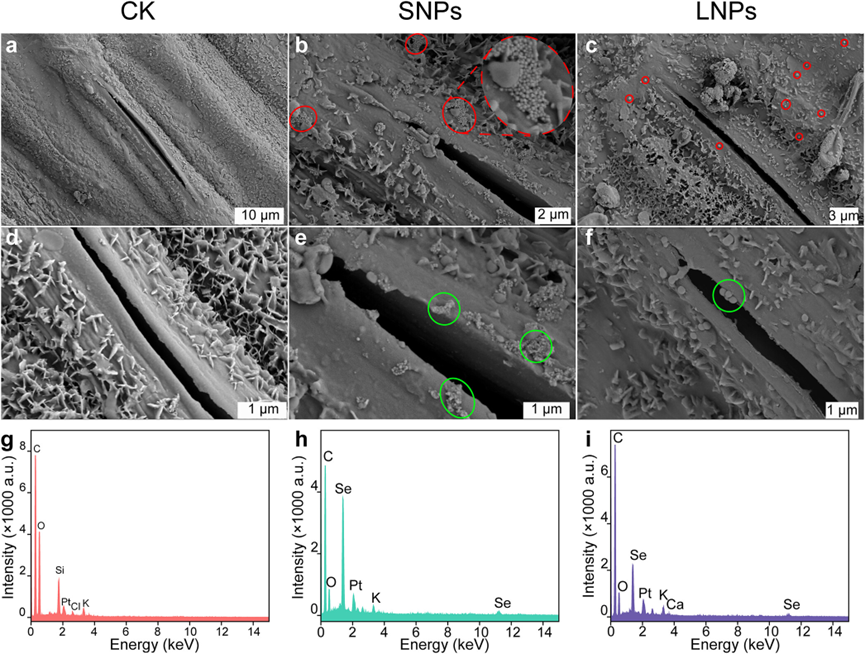 叶面施用的植物营养素必须穿过叶片表面屏障才能进入叶组织。如图2a、d所示,小麦叶片表面呈现粗糙结构,由富含脂质的外层表皮细胞壁覆盖着一层角质蜡质层构成,为抵御生物与非生物因素提供物理保护。施加硒纳米颗粒后,可观察到颗粒附着在叶片表面(图2b、c),且纳米颗粒与气孔存在明显共定位现象(图2e、f)。尽管存在颗粒聚集现象,但气孔开口显著大于纳米颗粒,这为颗粒穿过保卫细胞并渗入气孔下腔提供了可能,最终被叶片吸收。然而气孔通常仅占叶片面积的不到10%(44,45),且开放气孔的数量与大小也显著影响纳米颗粒的吸收。因此,非气孔途径很可能也在叶面纳米颗粒吸收中发挥重要作用。图2b、c显示纳米颗粒位于远离气孔的位置,表明其可能直接穿透角质层进入叶片。除以完整颗粒形式物理进入外,硒纳米颗粒也可能在叶片表面发生部分溶解,释放出的硒离子可通过气孔扩散或穿透角质层。此外,纳米颗粒表面的生物分子附着或冠状结构形成可能加速离子释放,并促进纳米颗粒渗透进入叶组织。