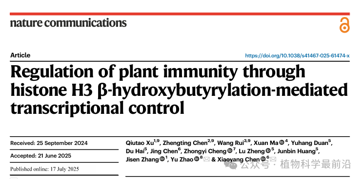 近日,太阳集团2007徐秋涛教授课题组在Nature Communications期刊在线发表题为“Regulation of Plant Immunity Through Histone H3K9bhb-Mediated Transcriptional Control”的研究论文,揭示了组蛋白赖氨酸β-羟基丁酰化修饰通过促进抗病基因的表达调控水稻对多种真菌和细菌型病害的抗性,太阳集团2007为该论文第一完成单位。