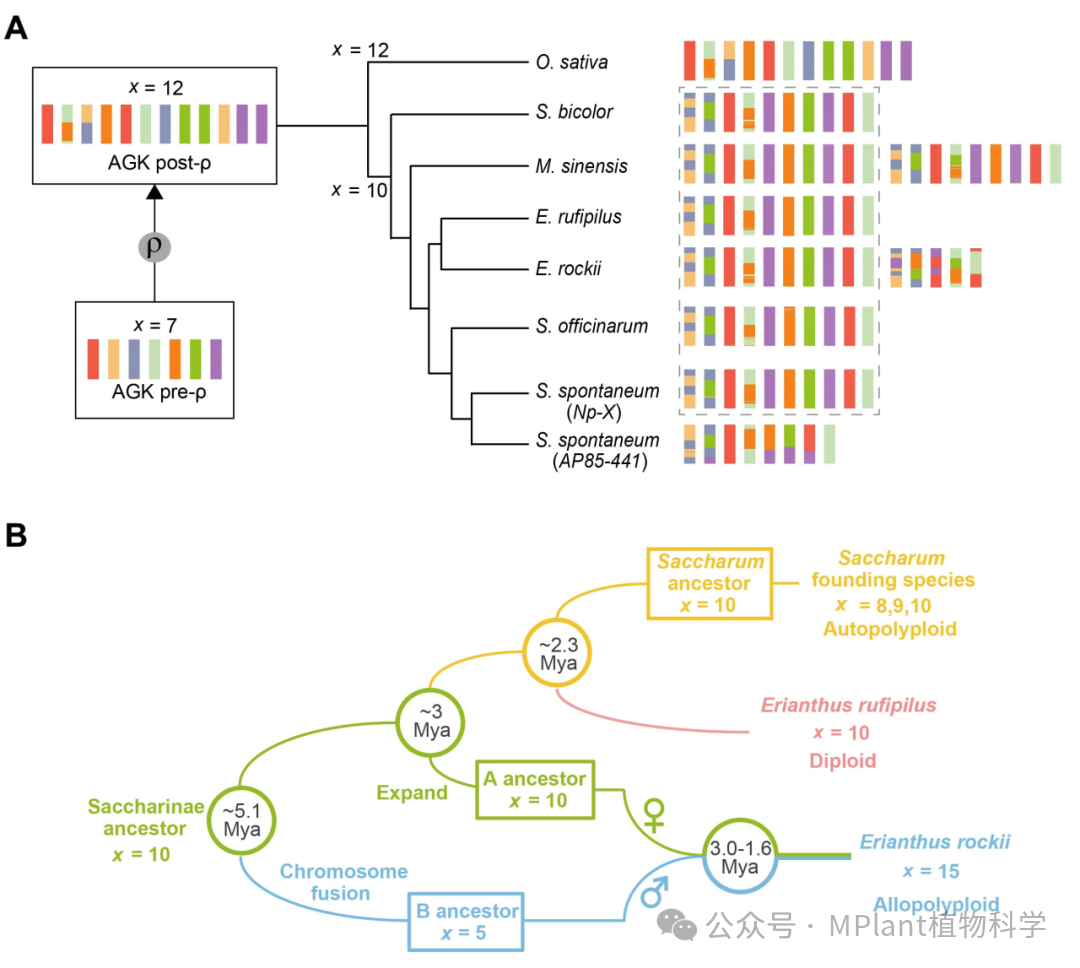 图2 甘蔗复合体的核型演化。(A)不同颜色的矩形代表禾本科祖先核型(AGK)的7条染色体。ρ代表全基因组加倍事件。(B)异源四倍体滇蔗茅的演化历史。