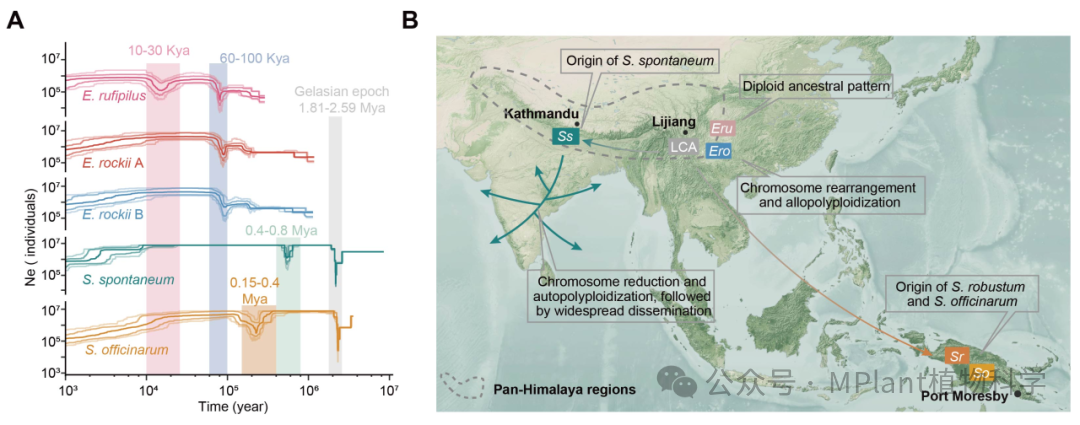 图4 (A)甘蔗复合体的群体历史。(B)甘蔗复合体的演化轨迹。